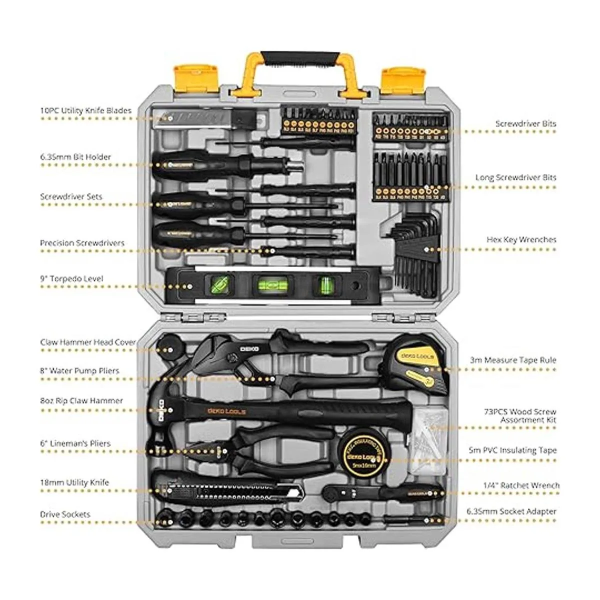 DEKOPRO Juego de herramientas de 150 piezas, kit de herramientas de mano para el hogar, kit de herramientas de reparación del hogar con caja de herramientas de plástico para proyectos de bricolaje, mantenimiento del hogar