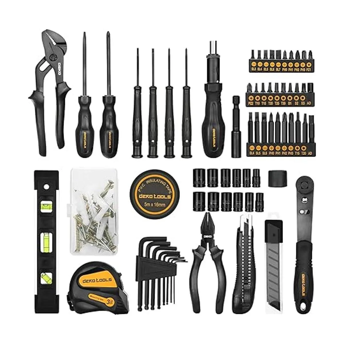 Kit de herramientas para el hogar: el kit de herramientas DEKOPRO 150 contiene las herramientas necesarias para la mayoría de pequeñas reparaciones y proyectos básicos de bricolaje alrededor de la casa. Perfecto para reparadores, trabajadores de la construcción, mecánicos.