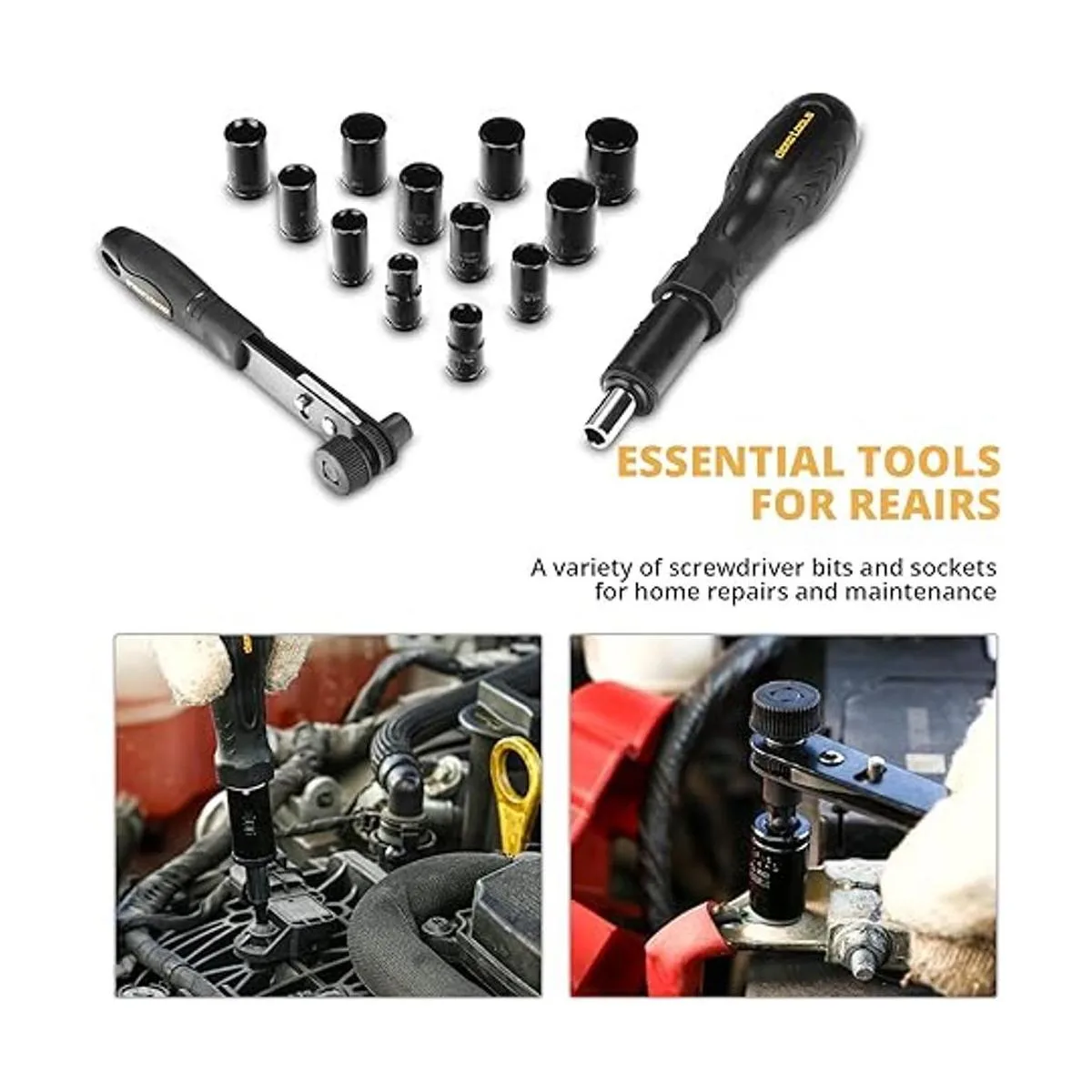 Kit de herramientas de alta calidad: forjado de acero al cromo vanadio y recubierto con acabado chapado en óxido para garantizar la máxima durabilidad y anticorrosión. Todas las herramientas cumplen o superan las normas críticas ANSI. Enchufes de acero al cromo vanadio y acero de alta calidad con una capa de óxido en la superficie.