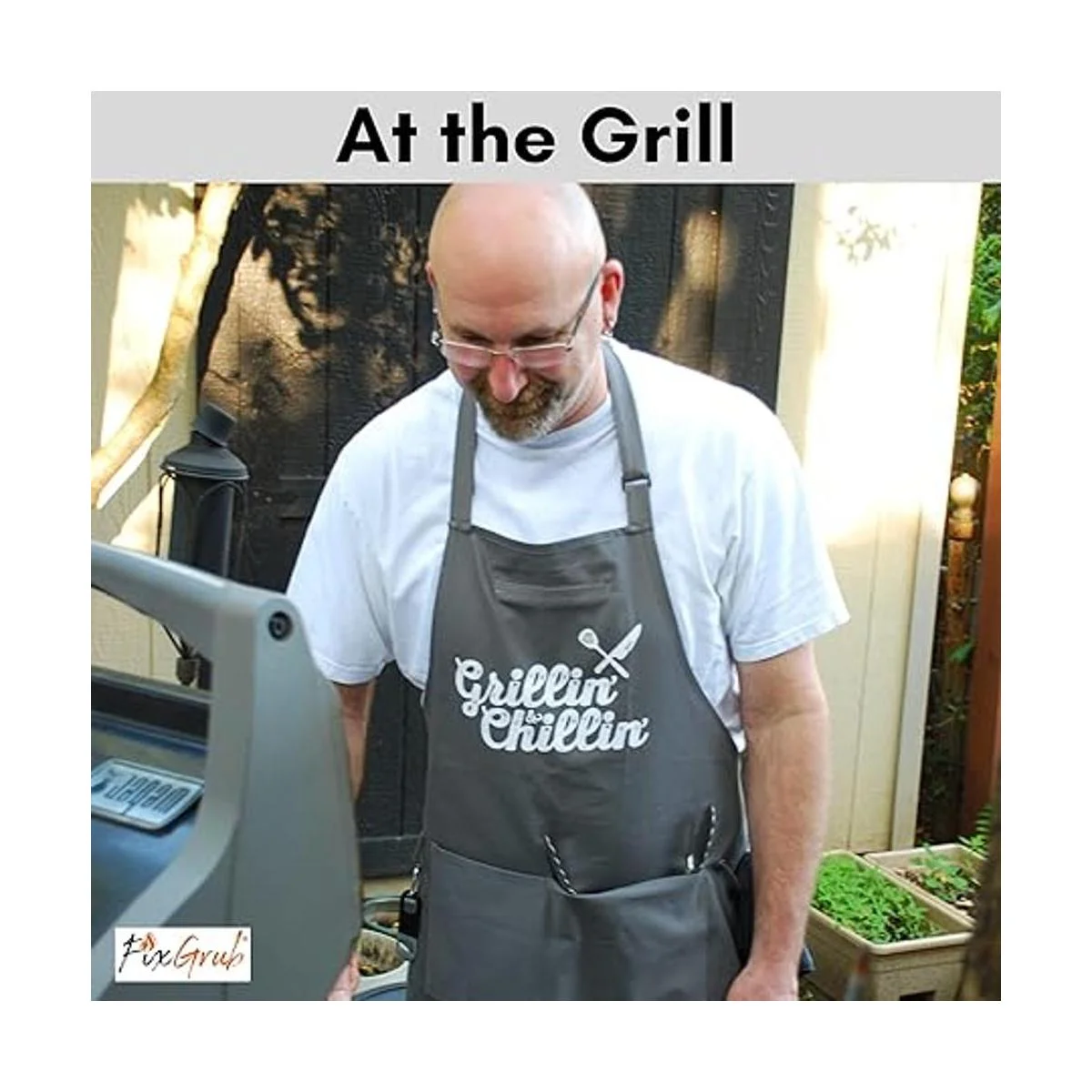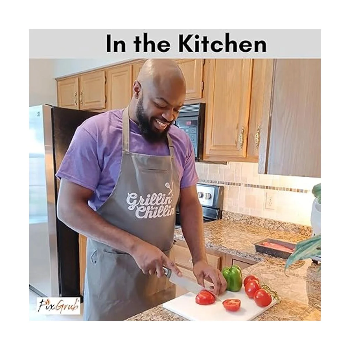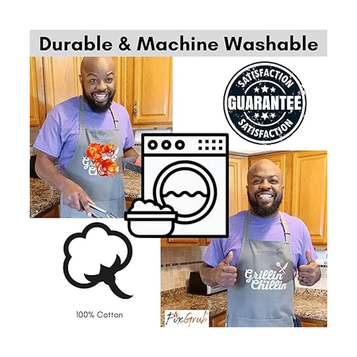 Delantal de chef para hombre, delantal de cocina, delantal divertido, delantal de barbacoa, 3 bolsillos, abridor de botellas, toalla y caja de regalo incluida, gris 100 algodón duradero calidad profesional
