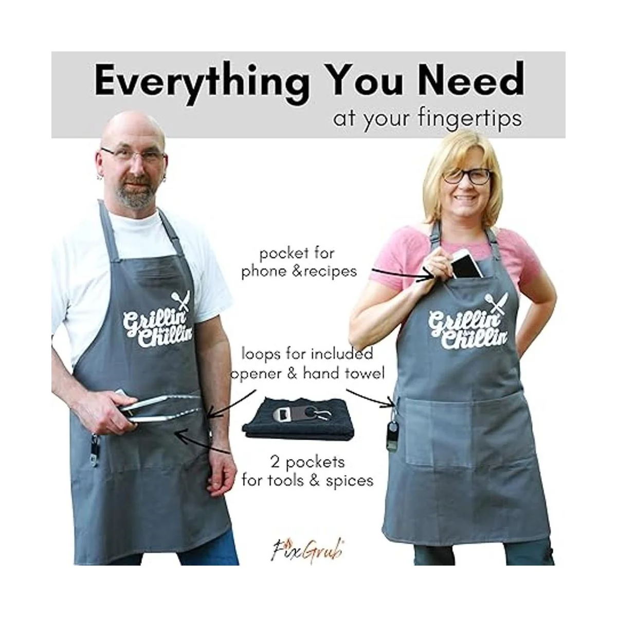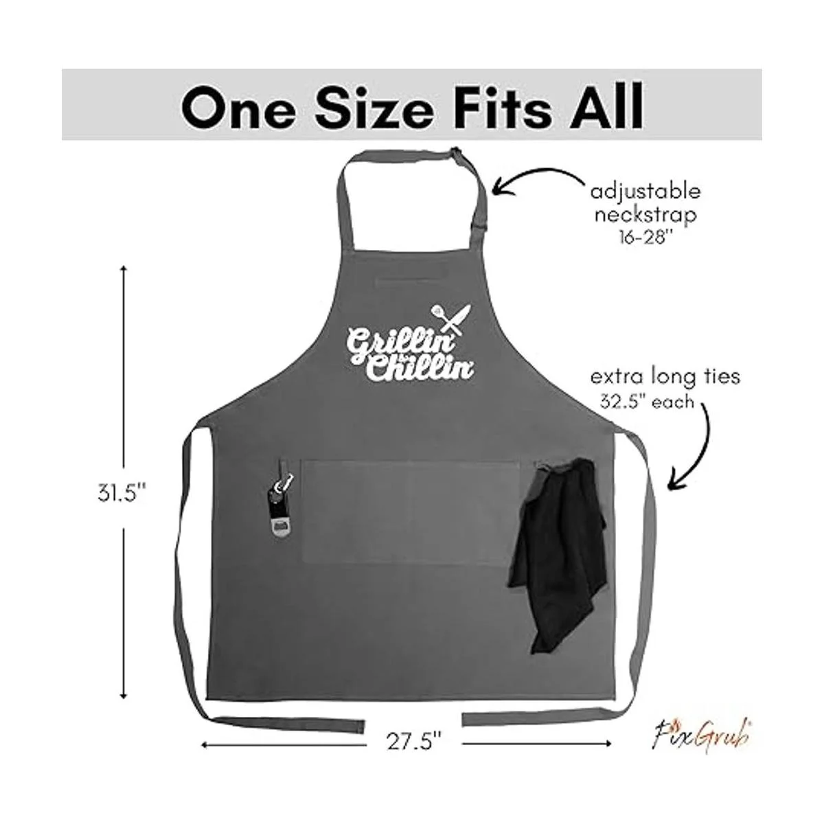 Prepárate y ahorra el día: te respaldamos con un abridor de botellas adjunto para que tú y tus amigos puedan permanecer hidratados. Mantén tu espacio de trabajo limpio con la toalla de mano incluida. Disfruta de los bolsillos reforzados: uno en el pecho para tu teléfono móvil y dos bolsillos grandes en la cintura para herramientas de barbacoa, especias y salsas.