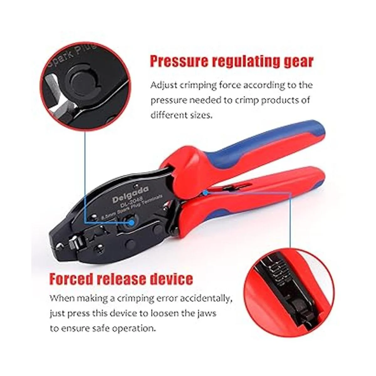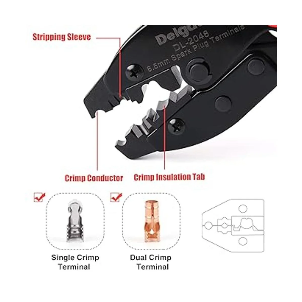Delgada Engarzadora de cables de bujía de trinquete, herramienta de pelado y engarzado para bujías, alicates de terminal de cable de encendido de 0.335 in de diámetro