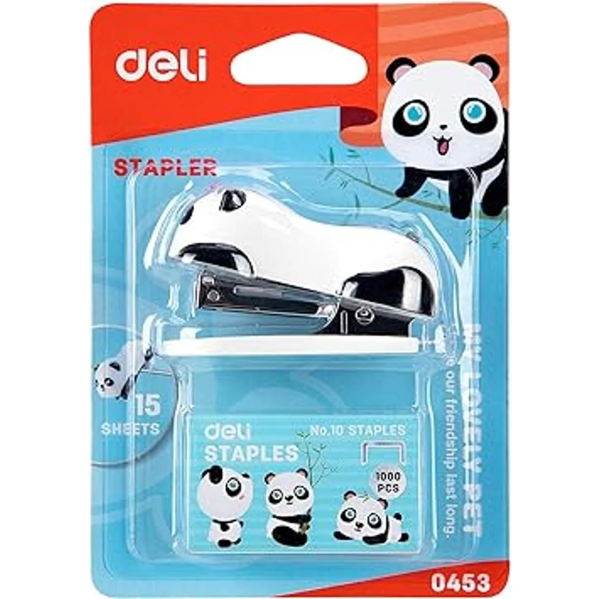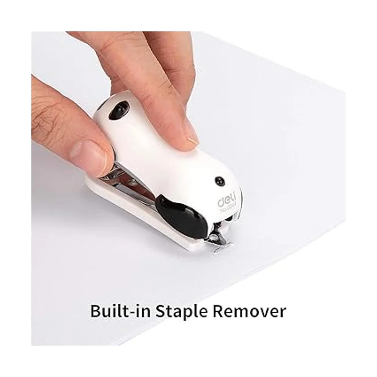 Deli Mini Lindo Panda Grapadora de escritorio, grapadora de oficina, capacidad de 12 hojas, incluye removedor de grapas incorporado y 1000 grapas No.10
