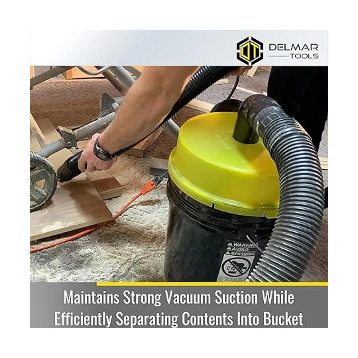 Se fija a cubos de 5 galones en segundos: el separador de polvo Delmar Tools separa el polvo del vacío en un recipiente separado, manteniendo tu filtro limpio y tu aspiradora funcionando durante más tiempo.