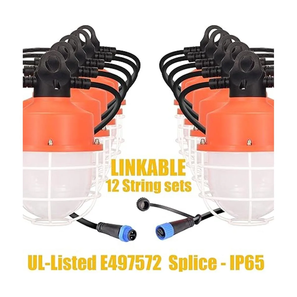 Cable listado en UL de 50 pies con cinco bombillas LED de 20 W guardadas en jaula, espaciadas a 10 pies y tapones impermeables diseñados para grandes espacios que necesitan iluminación brillante, como ático, luces de campamento al aire libre, invernadero, cochera, iluminación de espacio de rastreo, área de trabajo temporal al aire libre, eventos al aire libre, almacén
