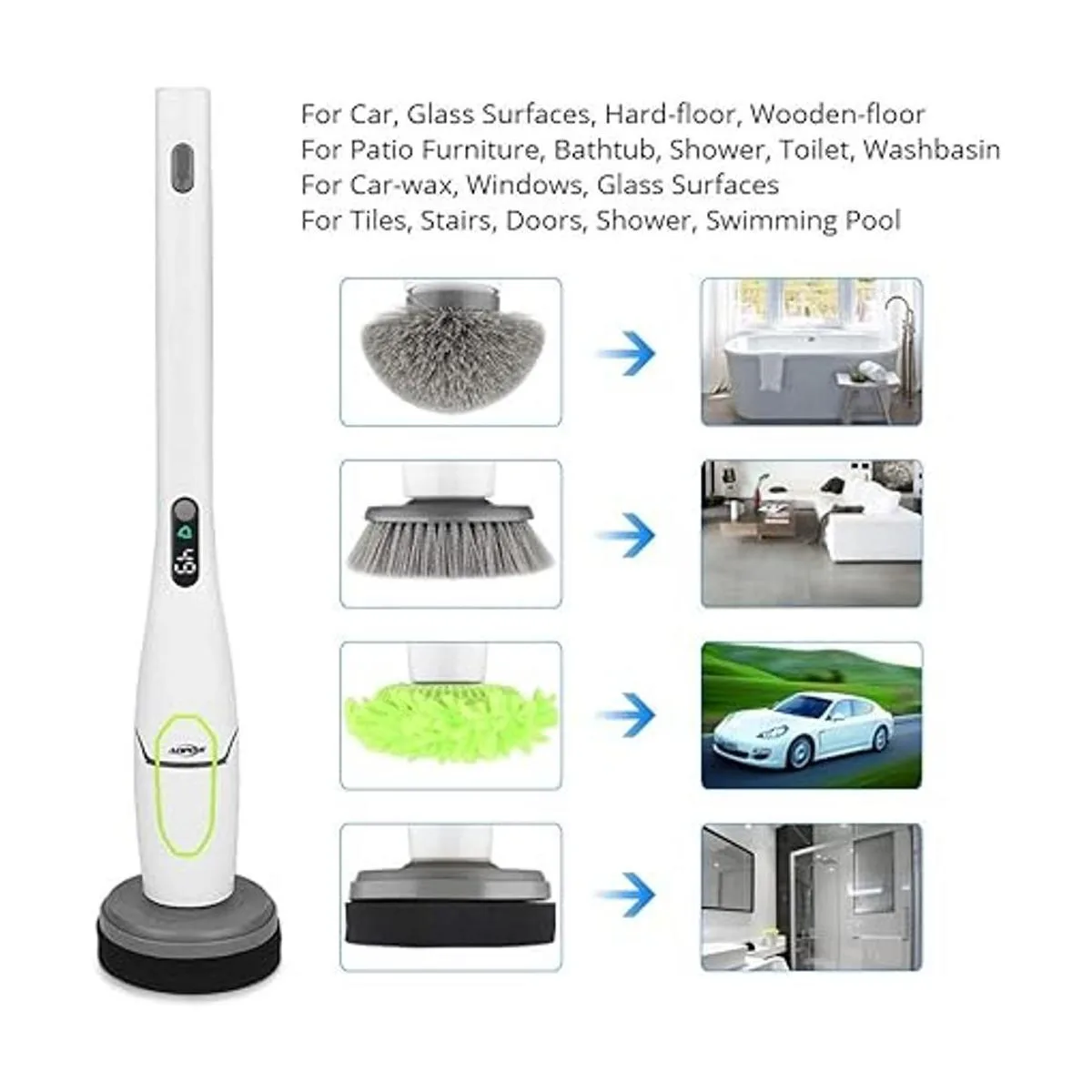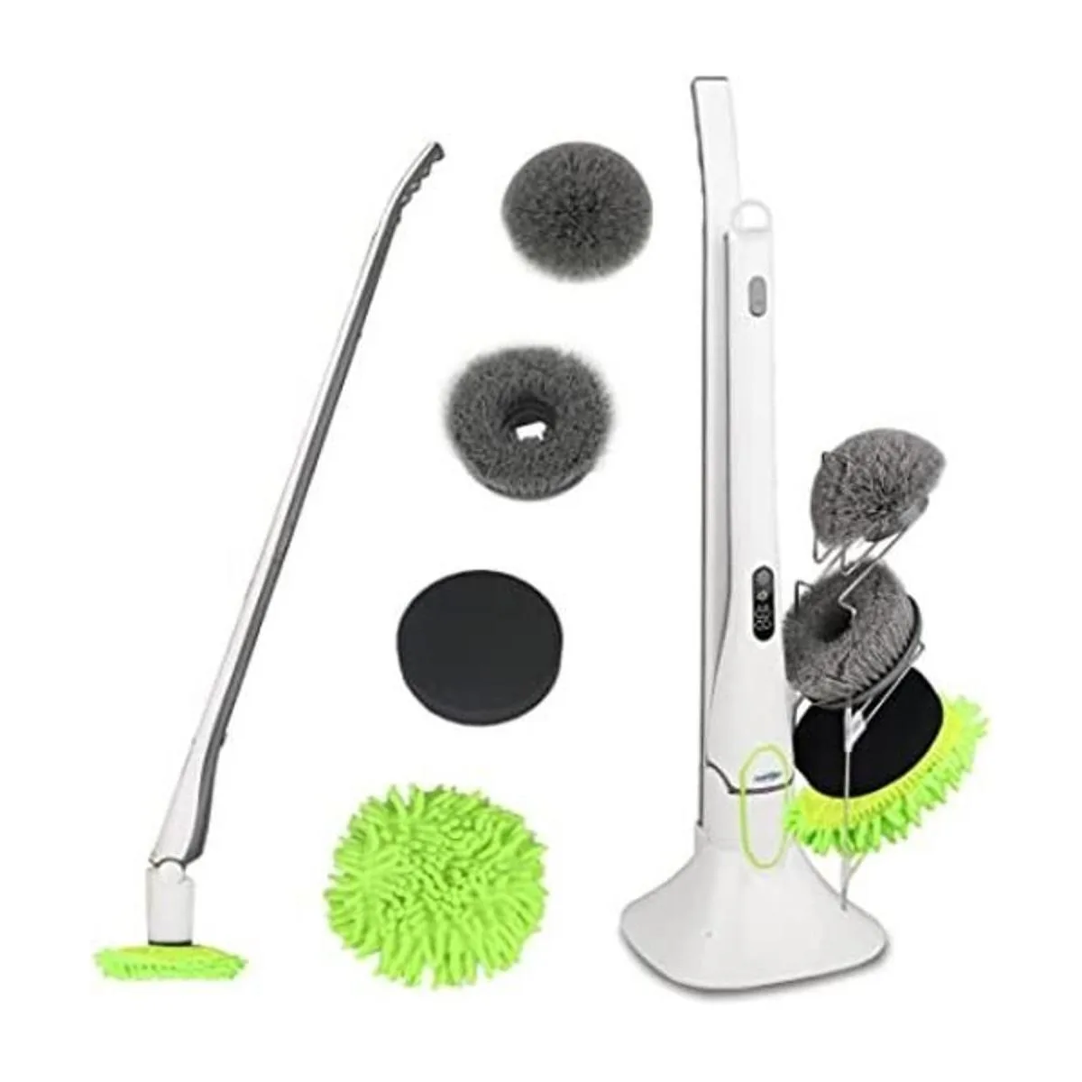 Depurador de giro, ADPOW mejorado con pantalla LED, limpiador de ducha inalámbrico con mango de extensión para el hogar, incluye cepillos de fregador, esponja y estante de almacenamiento