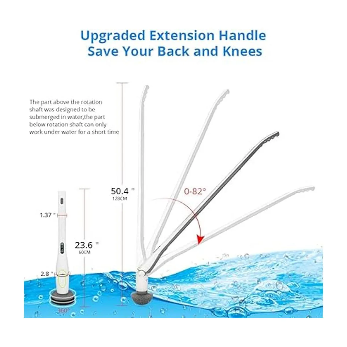 Mango mejorado, ahorra tu espalda y rodillas. Diferente de otros cepillos eléctricos giratorios y el cepillo eléctrico de ADPOW viene con un brazo de extensión mejorado y el mango de cepillos ajustables se puede ajustar para ser inclinado o versátil al pulsar el botón. También viene con un mango extensible de 50.0 in para que puedas frotar y limpiar esquinas difíciles de alcanzar sin necesidad de agacharte o arrodillarte para hacer limpieza, especialmente saludable para dolor de rodillas y espalda y artritis.