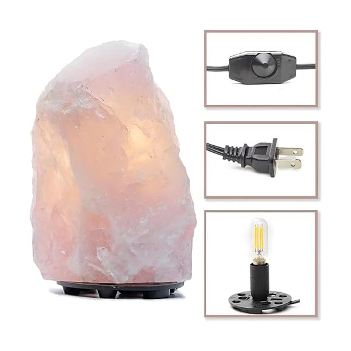 Bombilla LED regulable que se coloca en un hueco dentro de la piedra, y un cable de atenuación con un interruptor de dial fácil de girar. La lámpara desde la base hasta la punta de la piedra mide aproximadamente 6 pulgadas de alto por 3 pulgadas de ancho. La luz es una lámpara estándar de 115 voltios.
