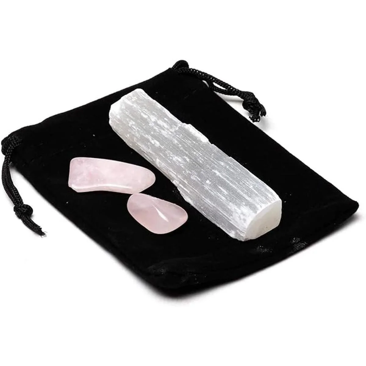 Viene con palo de selenita y dos piezas de cuarzo rosa caído en su propia bolsa de transporte.