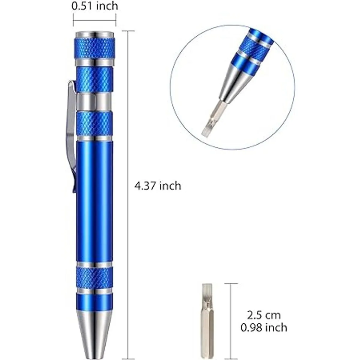 Diseño en forma de bolígrafo: el destornillador de bolsillo está diseñado en forma de bolígrafo, hay 8 cabezales de destornillador diferentes dentro del bolígrafo y un pequeño imán en la parte inferior que puede fijar firmemente los cabezales del destornillador