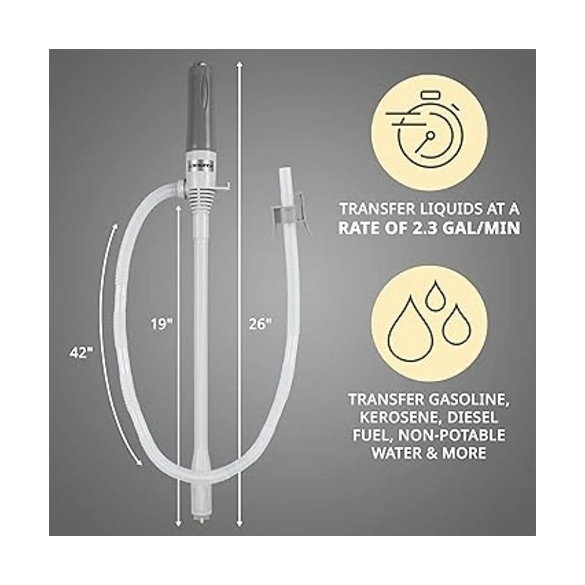 Potente manguera de transferencia para todos los usos: el dispositivo portátil te permite sifón y transferir todo tipo de líquidos y combustibles no corrosivos con el giro de un interruptor. Para uso con gasolina, queroseno, diesel, aceites ligeros, agua no potable, insecticidas químicos, jabones, detergentes, desodorantes, ácidos suaves, anticongelantes y más allá.