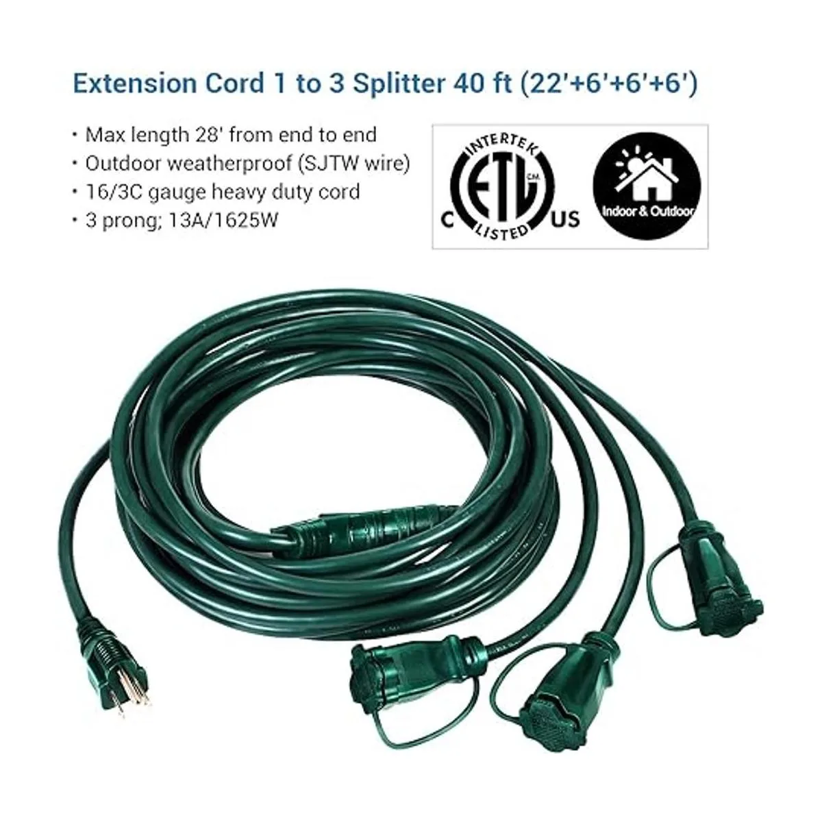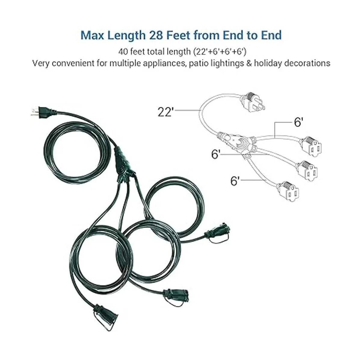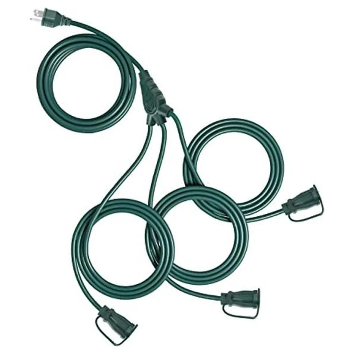 1 to 3 Cord Splitter 40 Ft total length 22666; expands 1 wall outlet into 3 extended outlets up to 28 feet from end to end; green 3way power cord splitter helps use less cords to set up landscape lighting and Christmas decoration easily