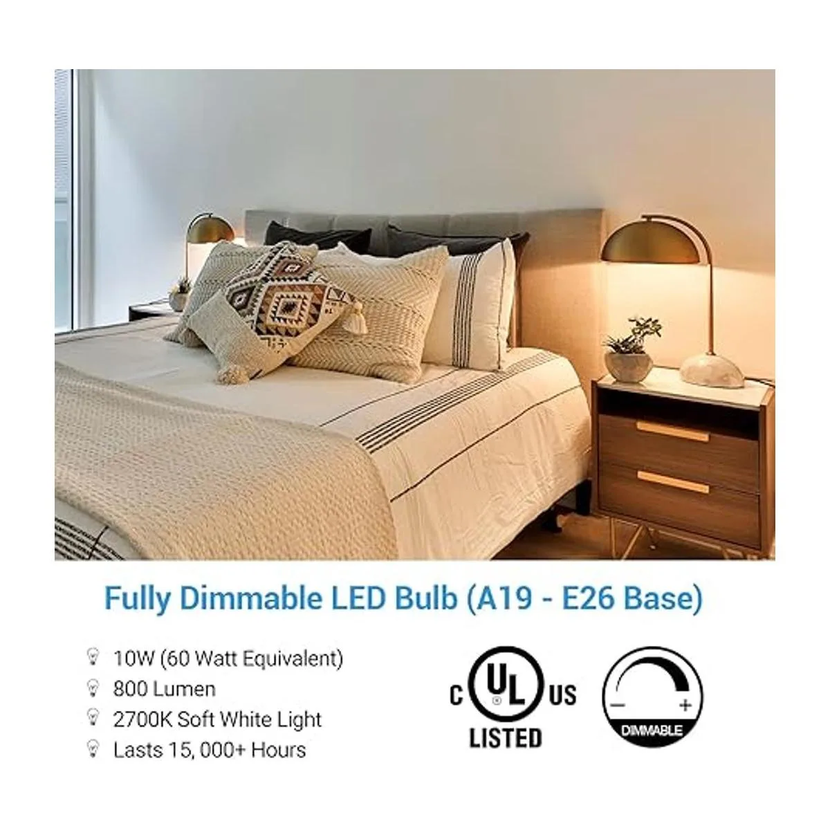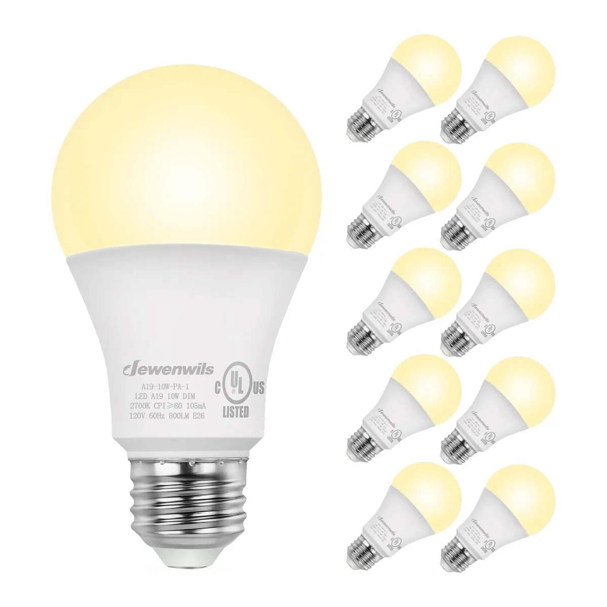 DEWENWILS Paquete de 10 bombillas LED A19 regulables, luz blanca suave con brillo cálido, 800 lúmenes, 2700 K, 10 W equivalente a 60 vatios, base de tornillo medio E26, certificación UL