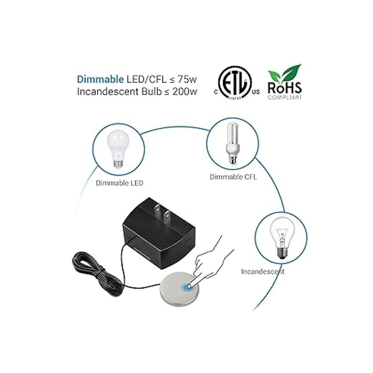 Regulador de intensidad compatible con LED: el interruptor de atenuación de luz en línea funciona con bombillas LED / CFL regulables de hasta 75 vatios o incandescente de 200 vatios; voltaje de entrada de 120 VCA; cable de extensión de 8 pies te permite colocar la almohadilla táctil en un lugar conveniente; la almohadilla antideslizante en la parte inferior evita que se deslice durante el proceso de atenuación