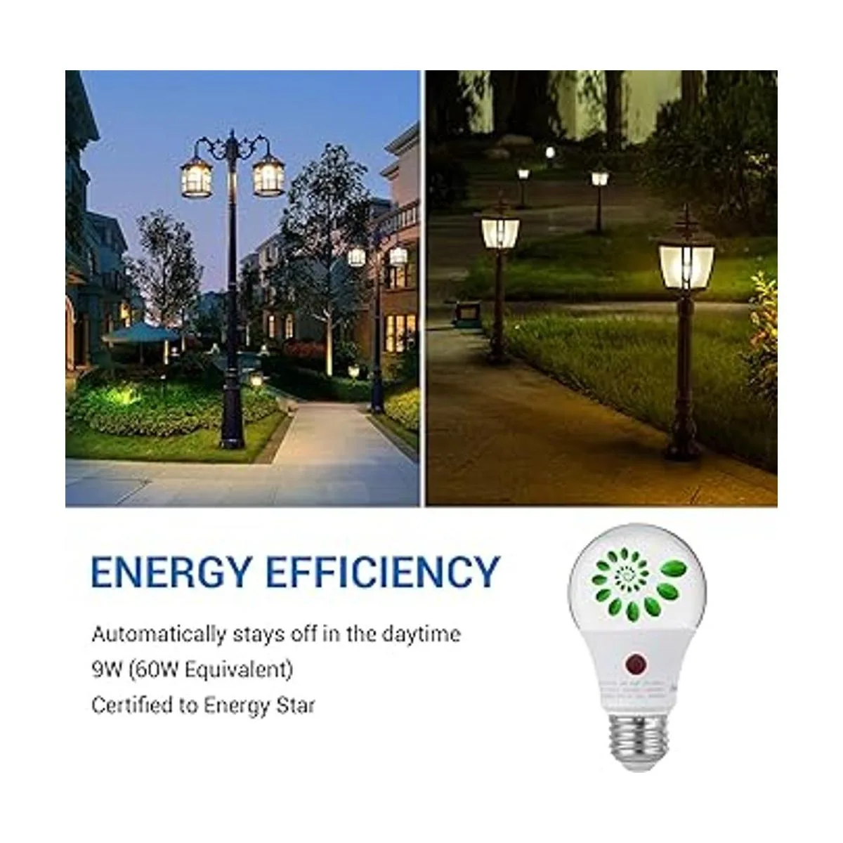 DEWENWILS Paquete de 4 bombillas LED de iluminación al aire libre, sensor de fotocélula automático inteligente de encendidoapagado A19 E26 para porche, 2700 K, blanco cálido suave, 9 W equivalente a 60 W, 800 LM, certificado UL
