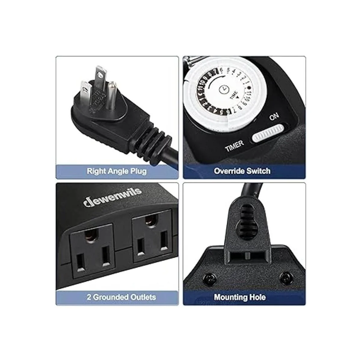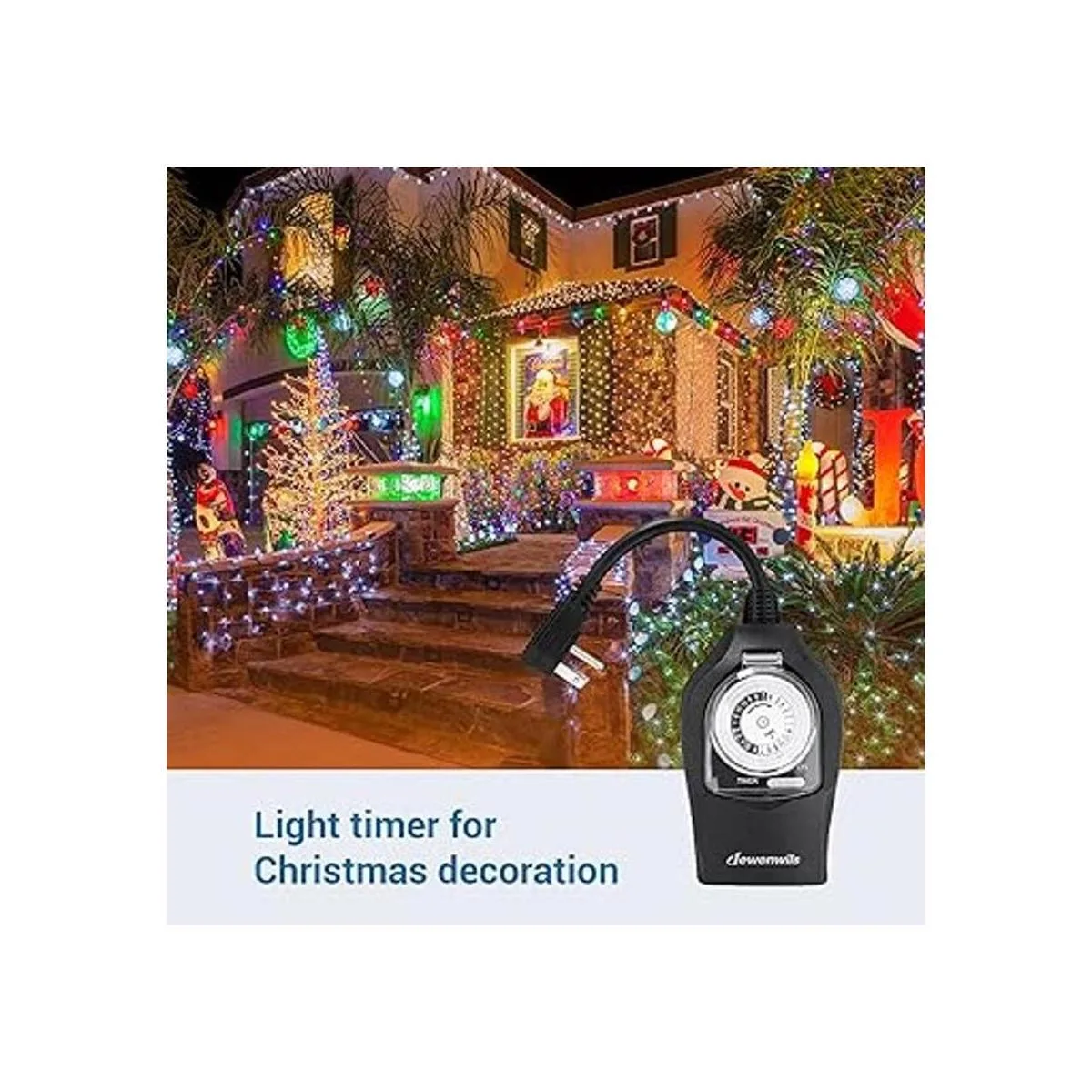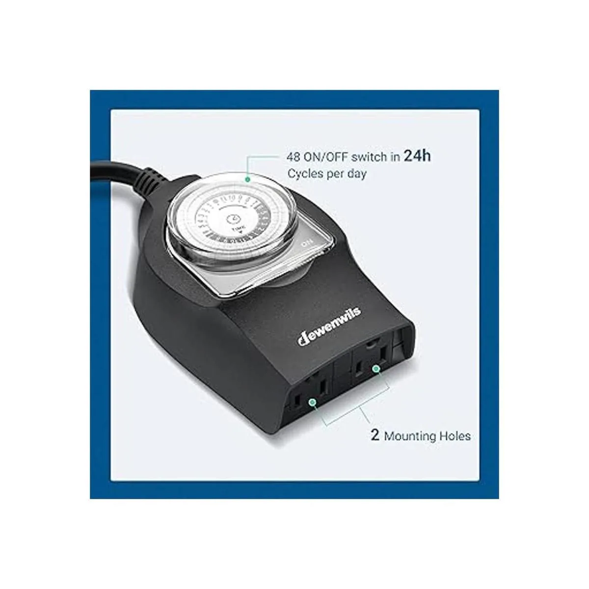 DEWENWILS Temporizador de exterior para luces impermeable, temporizador mecánico con enchufe de 24 horas, interruptor de temporizador programable de alta resistencia con 2 salidas a tierra para decoraciones de Halloween, certificación UL de 15A 12HP