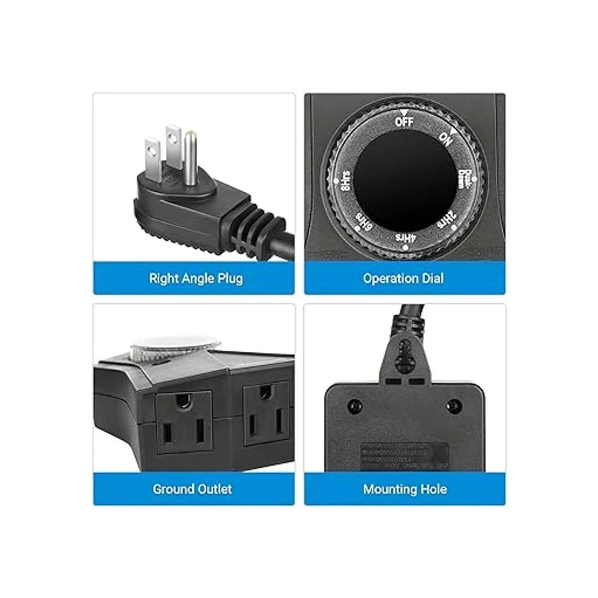 3 salidas a tierra: clasificadas en 125 voltios, 15 A, 1875 W resistente, 1/2 HP; se puede utilizar con la mayoría de aparatos eléctricos como luces de cadena al aire libre, decoraciones de jardín, luces de vacaciones, luces de Navidad, mientras que las 3 tomas de tierra pueden ejecutar 3 aparatos simultáneamente