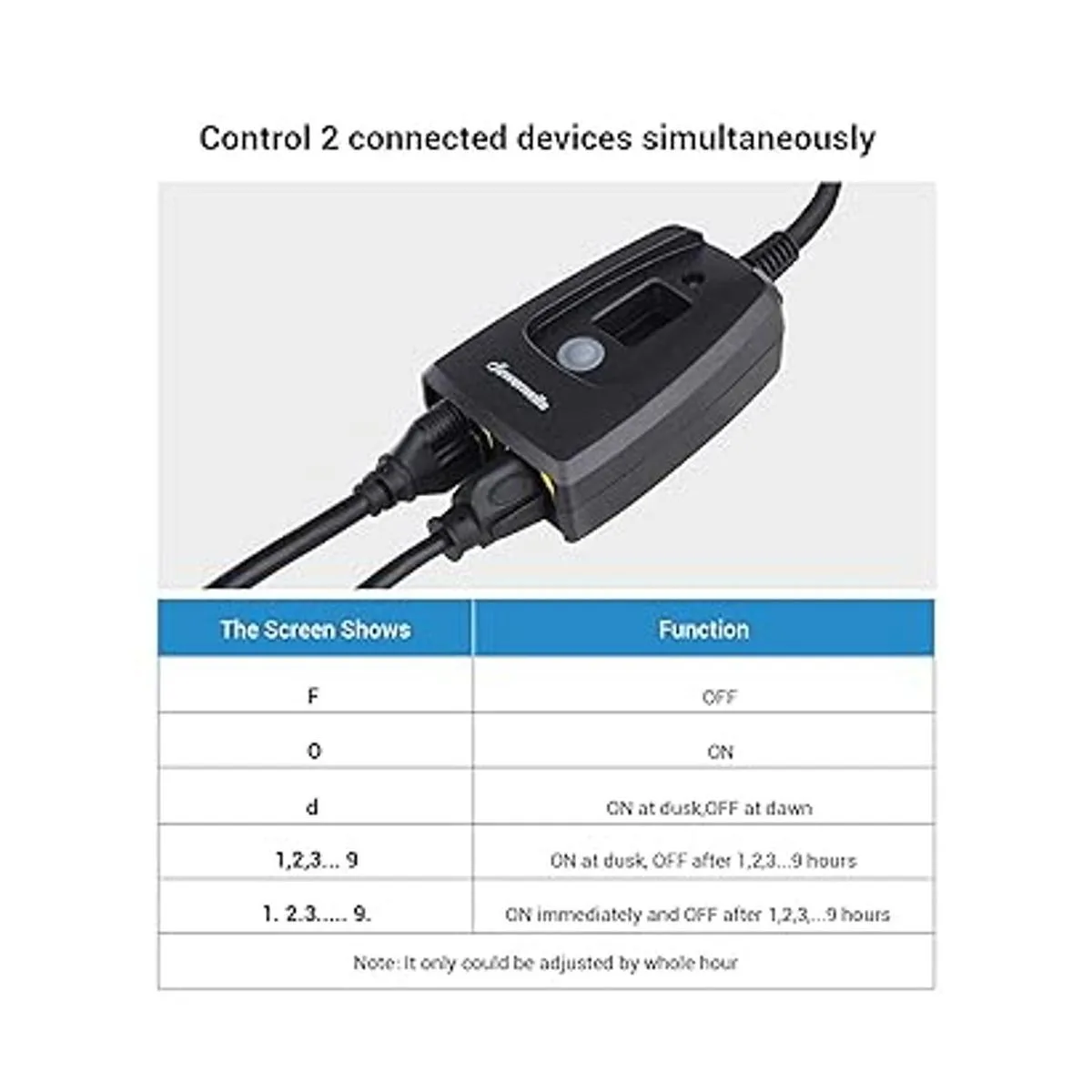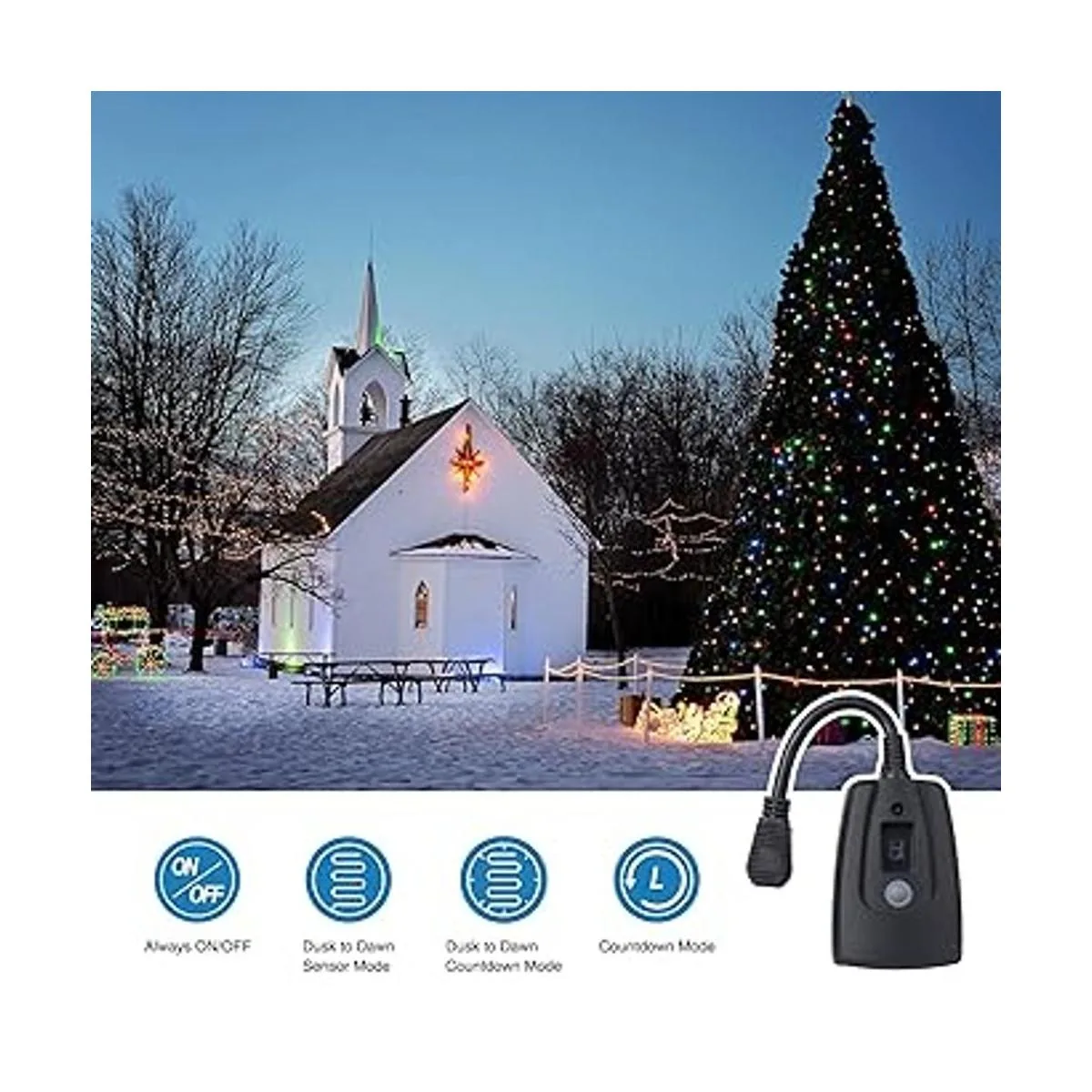 DEWENWILS Temporizador de luz para exteriores, sensor de luz enchufable impermeable y temporizador de cuenta regresiva con 2 tomas de tierra para cadena de luces de vacaciones de jardín, decoraciones de Halloween, 15A, 12 HP, certificación UL
