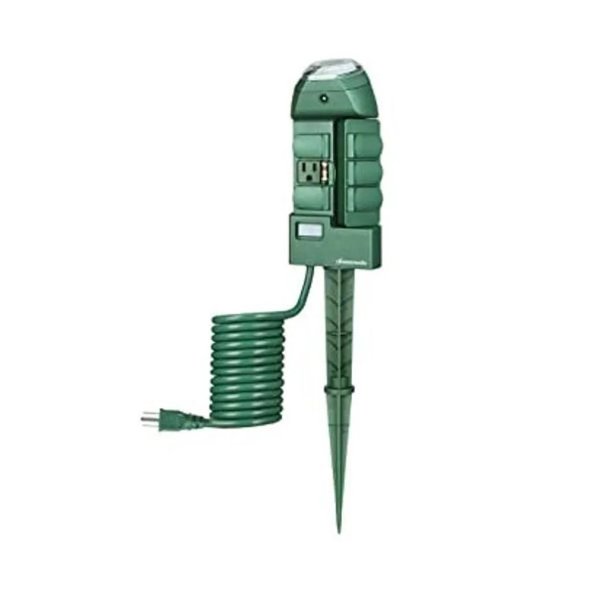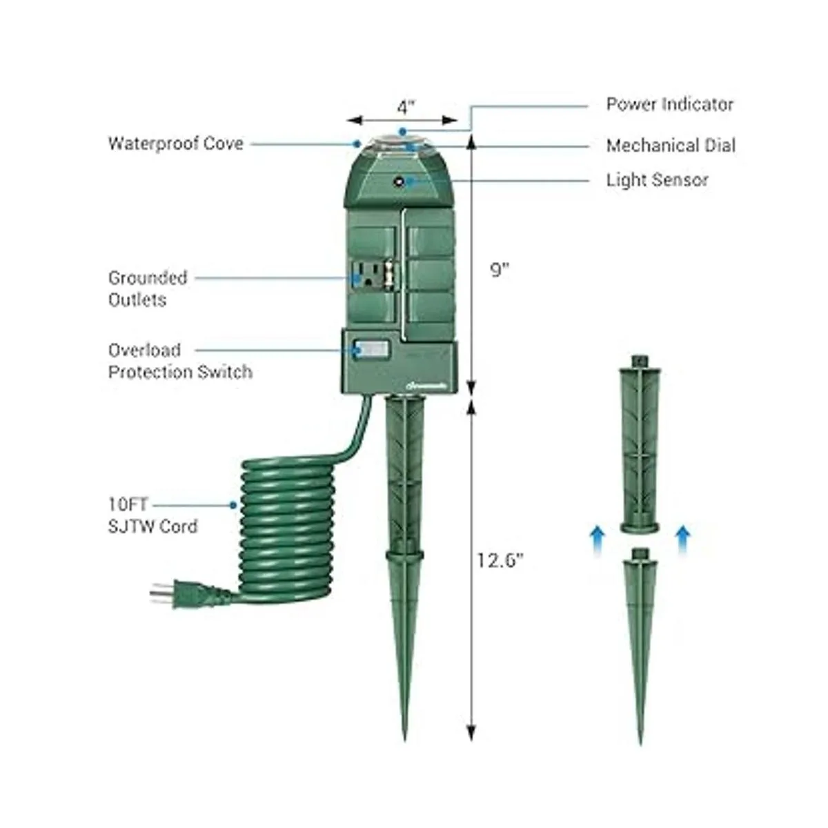 Fácil de instalar y operar: monta tres partes y cuña la estaca en el suelo, conecta el temporizador en el enchufe de pared, conecta tus dispositivos y gira el dial en sentido horario o contrario a las agujas del reloj para el tiempo deseado