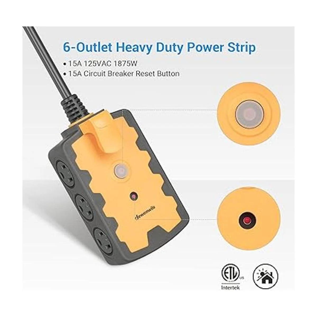 DEWENWILS Tira de alimentación de taller, tira de 6 salidas con cable de extensión de 15 pies, calibre 143C resistente, cable de alimentación SJTW para interiores y exteriores, disyuntor de 15 A, cubiertas de seguridad giratorias, listado ETL