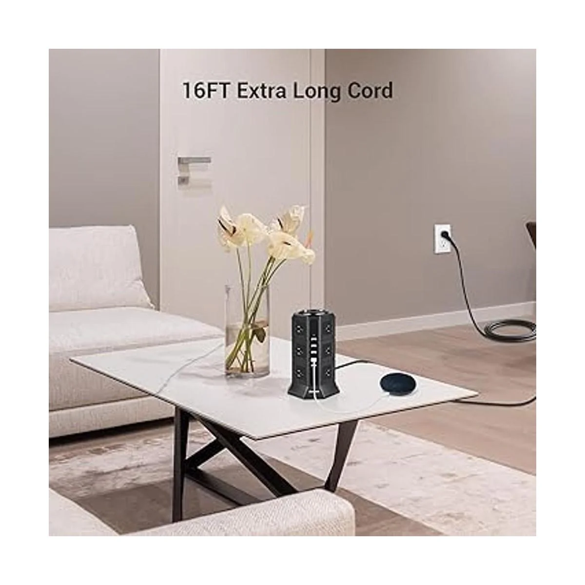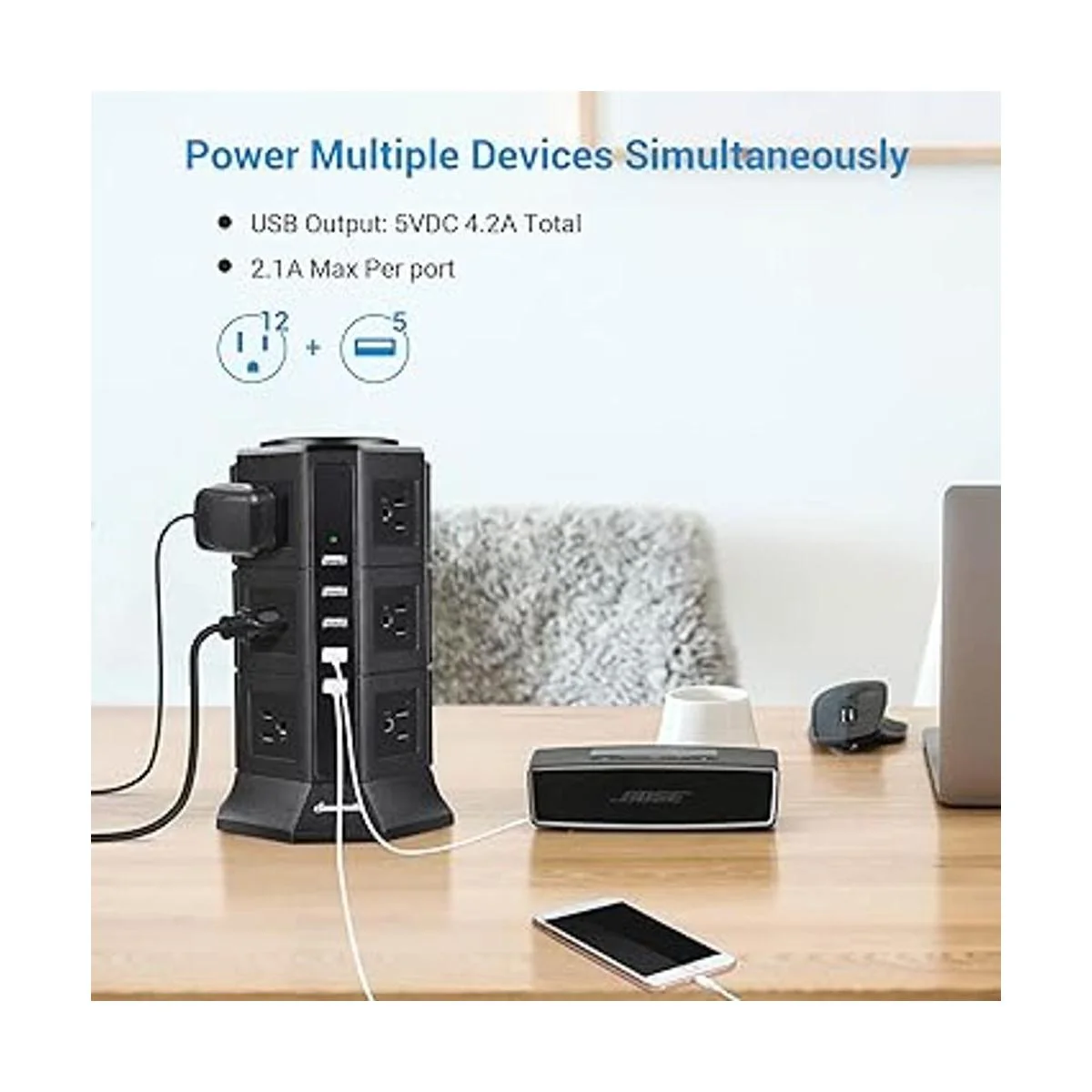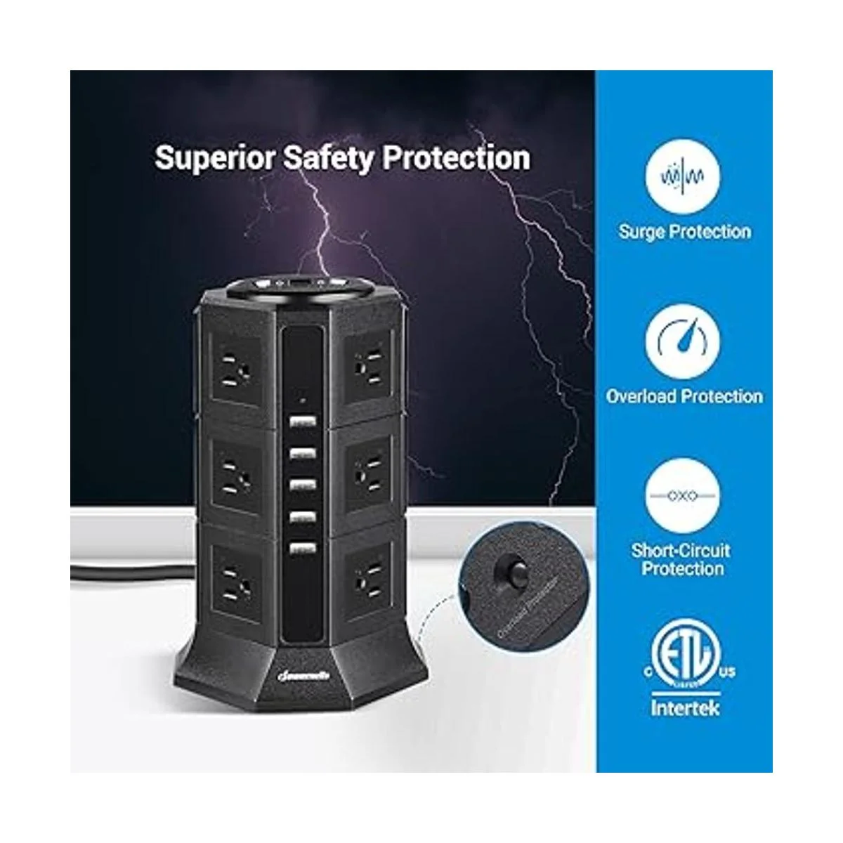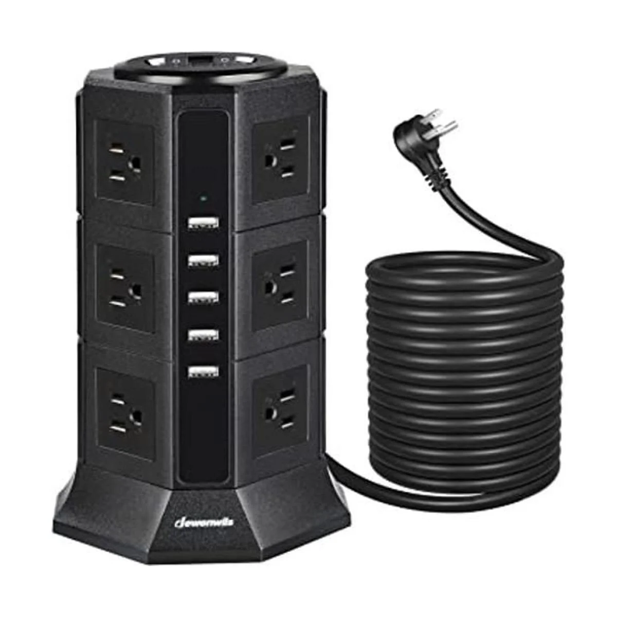 DEWENWILS Torre de regleta de alimentación de 16 pies, estación de carga de 12 salidas con 5 puertos USB, control de 2 interruptores, enchufe plano, protector de sobretensión de 1500J, protección de sobrecarga de 15 A, listado ETL, negro