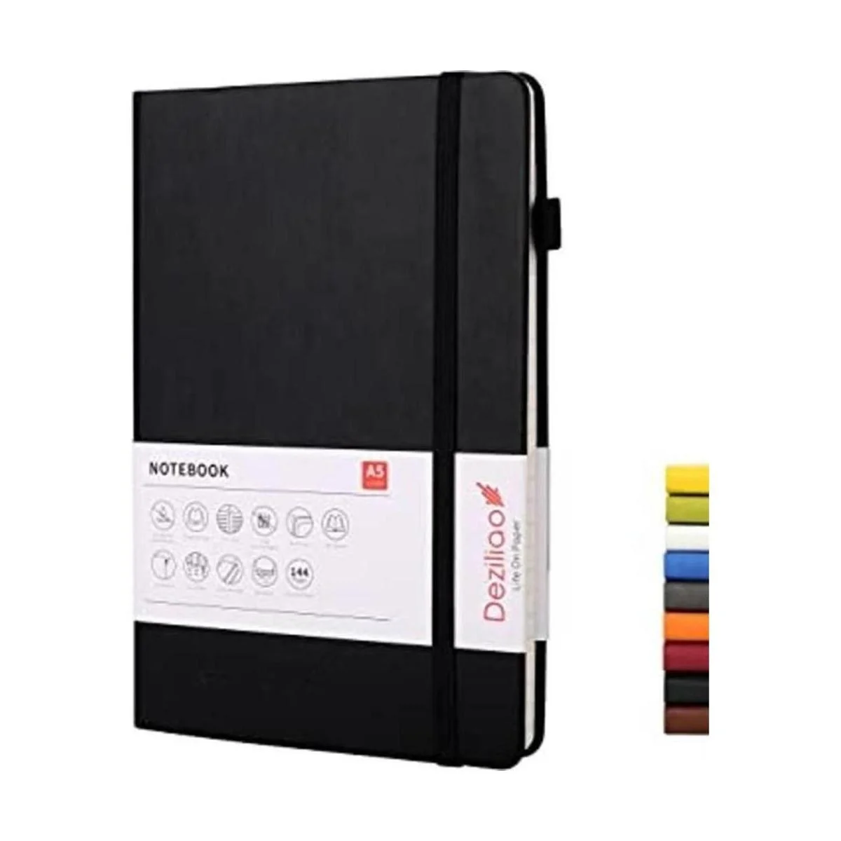 Deziliao Cuadernos forrados para diario, con lazo para bolígrafo. Cuadernos de tapa dura para trabajo, papel grueso de 100 Gsm con bolsillo interior, tamaño mediano de 5.7 x 8.4 pulgadas, negro, rayado.