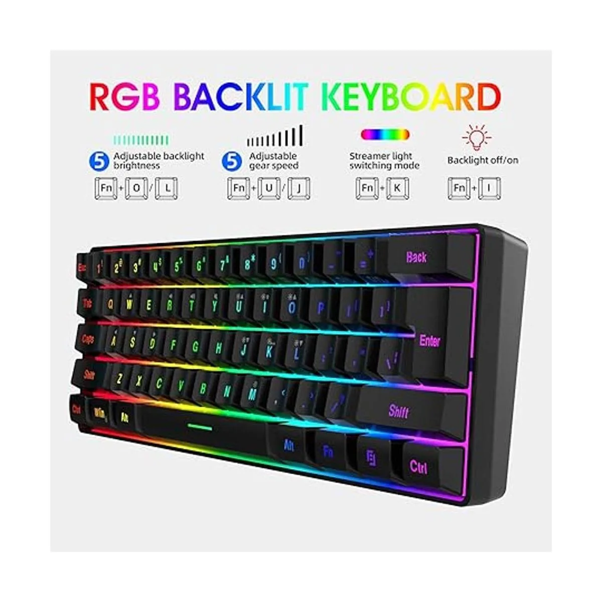 DGG Teclado K60 de 61 teclas RGB retroiluminado 60 con cable, ergonómico impermeable, mini compacto 60 sensación mecánica, para PC, Mac, PS4, Xbox Gamer, mecanógrafo, viajes