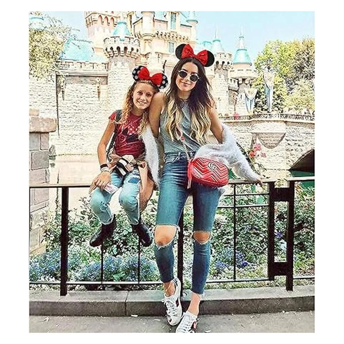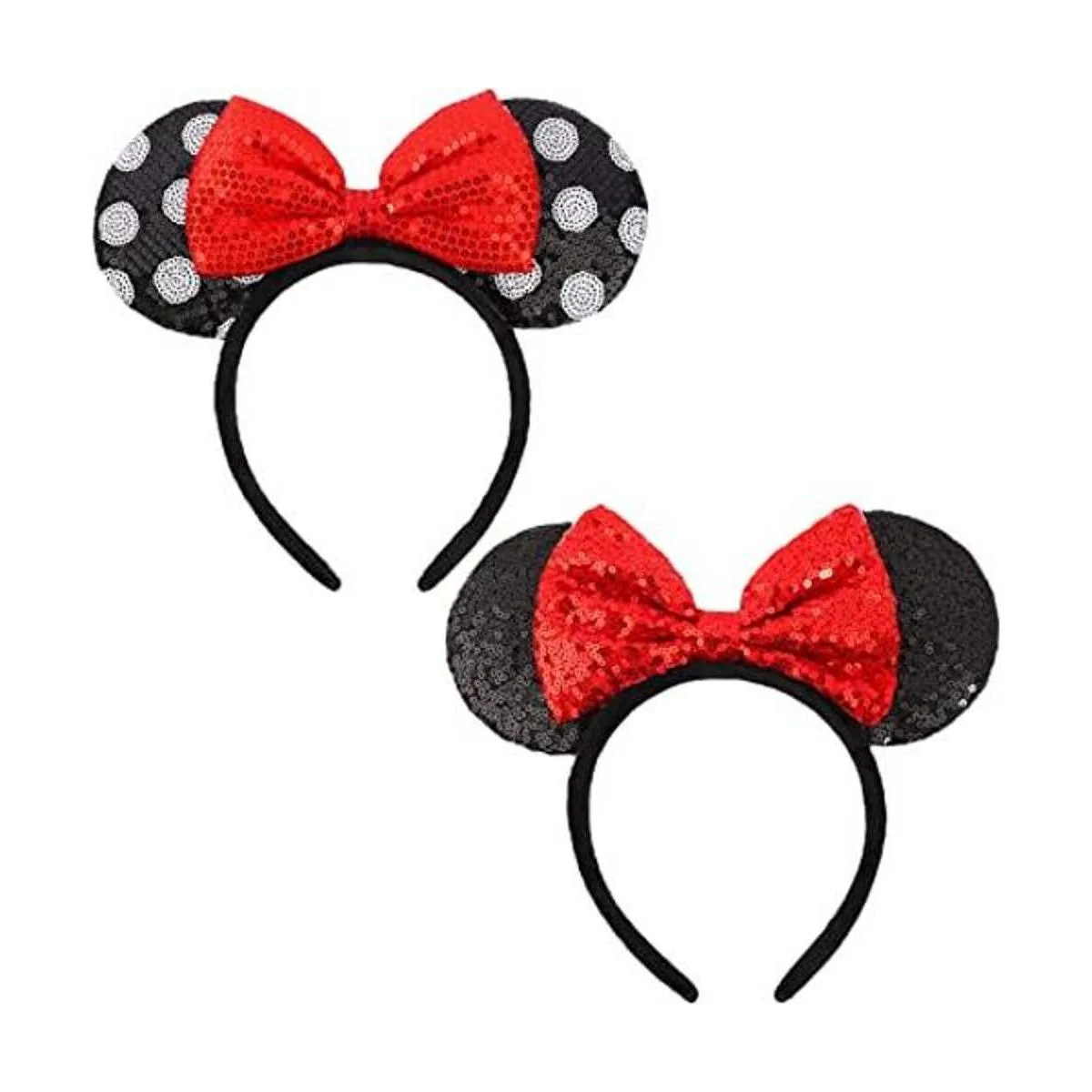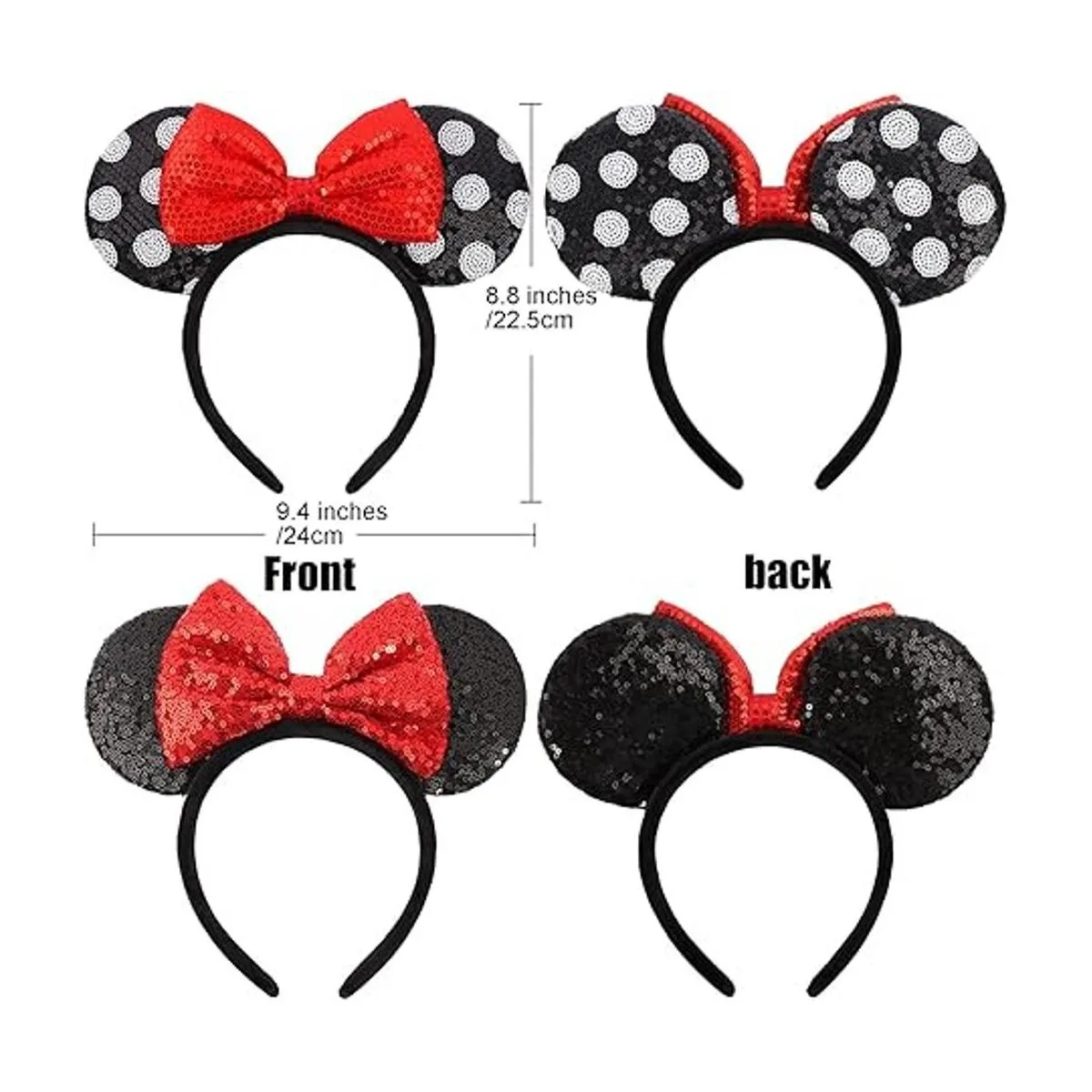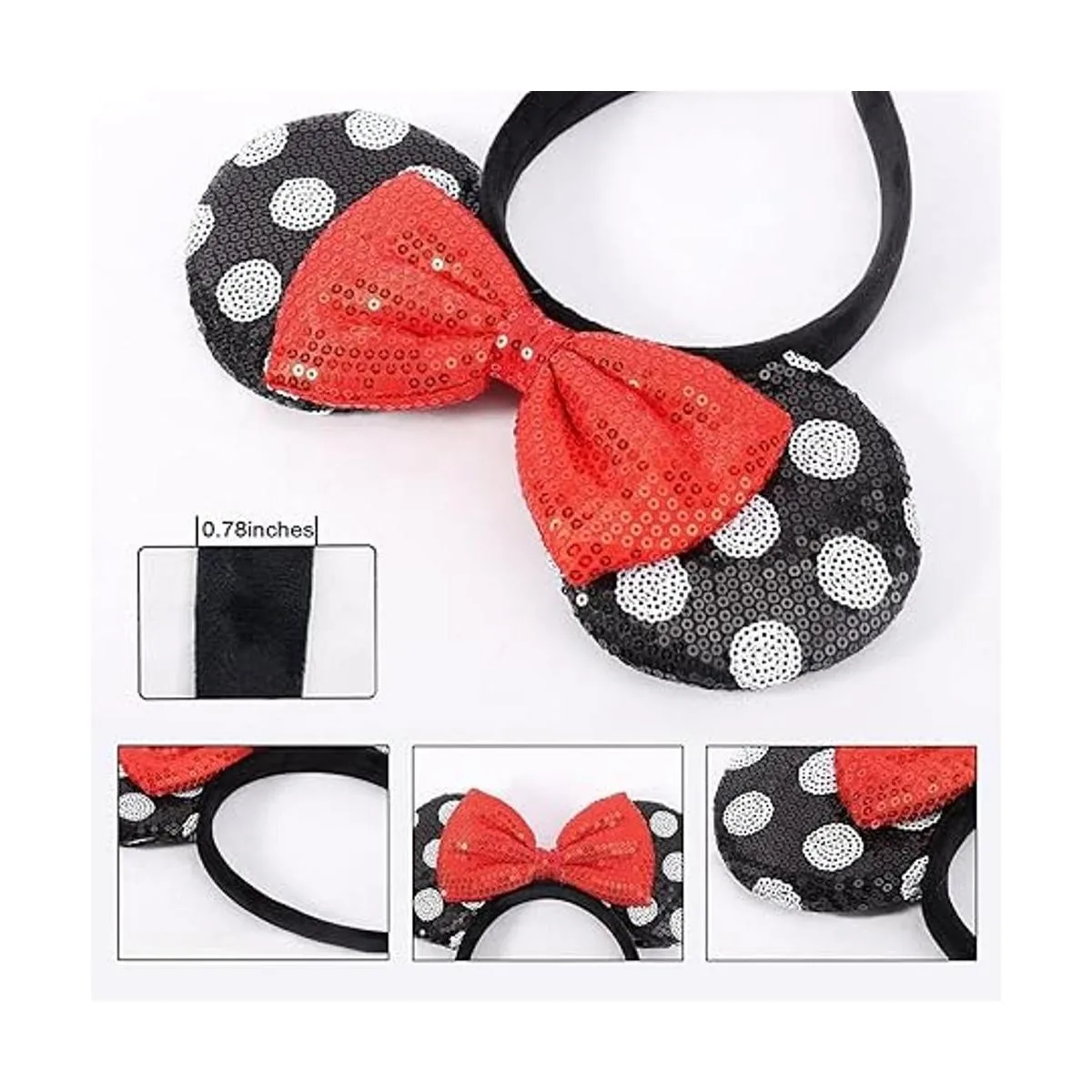 Diademas con orejas de ratón, 2 piezas clásicas con lazo de lentejuelas para mujeres, niños lazo rojo y lunares blancos