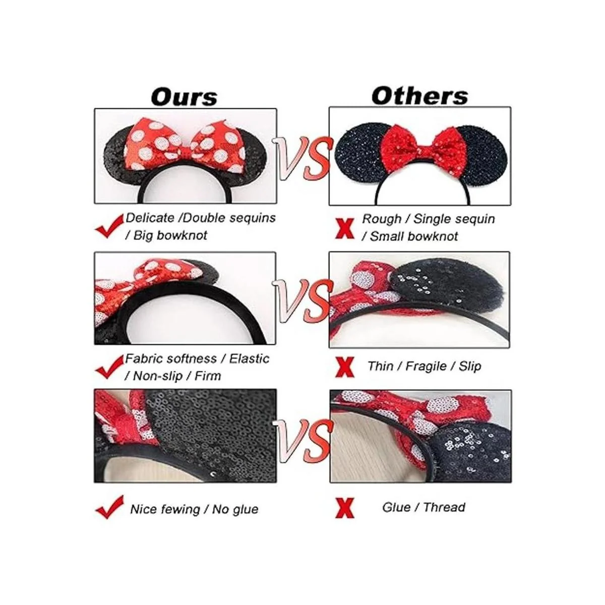 Hecho a mano y de alta calidad Todas nuestras diademas con orejas de ratón están hechas a mano con costuras finas, y las lentejuelas son uniformes y no se caen. La forma brillante del lazo es más grande y no se deforma. La diadema está ampliada y diseñada para ser firme, estable y elástica, y no se desliza fácilmente.