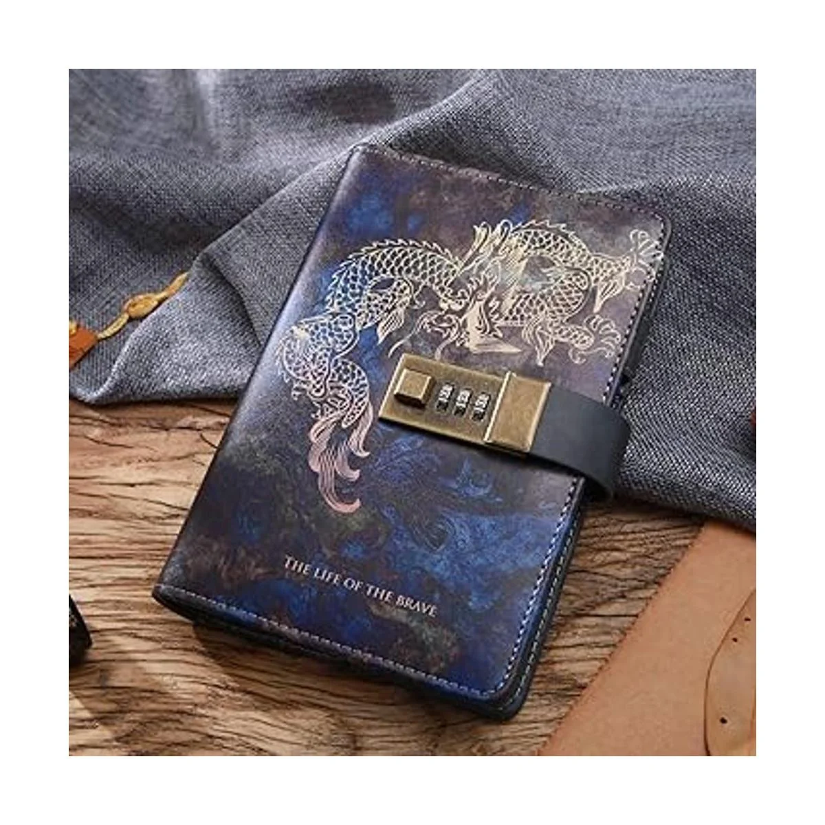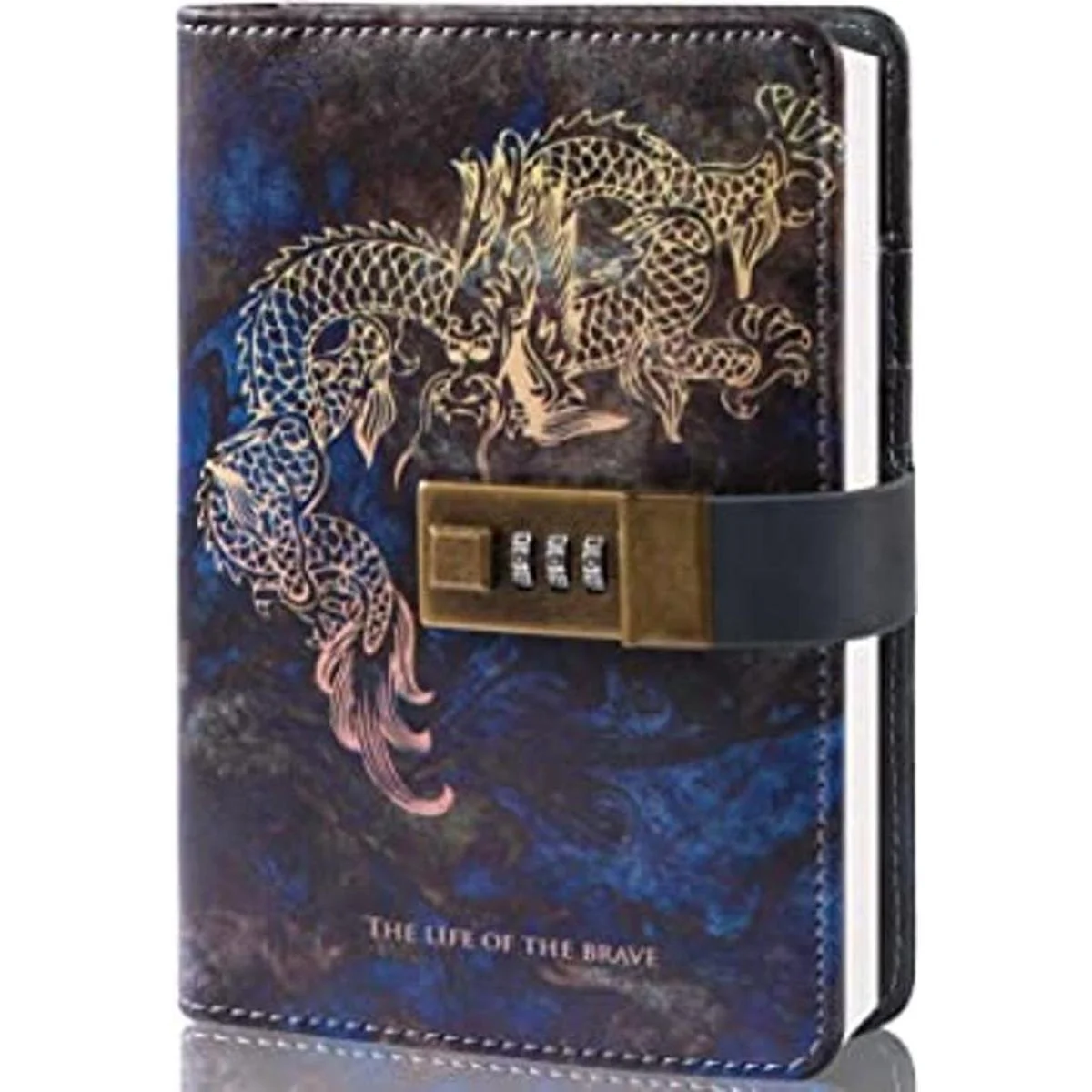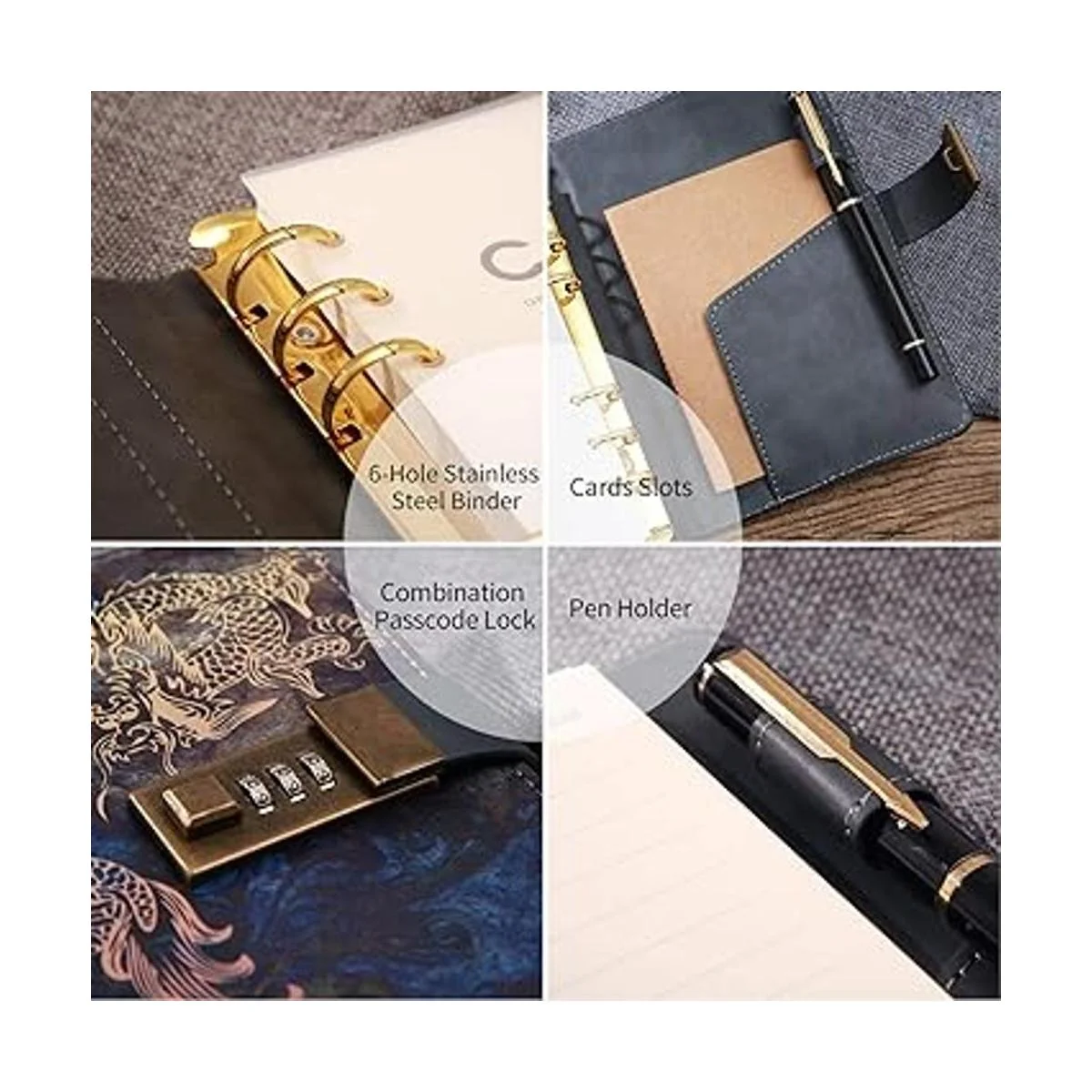 Diario con bloqueo A6 pequeño diario de bloqueo de bloqueo para adultos de piel sintética con 6 anillas, repuesto, dragón, 6.7 x 3.9 in
