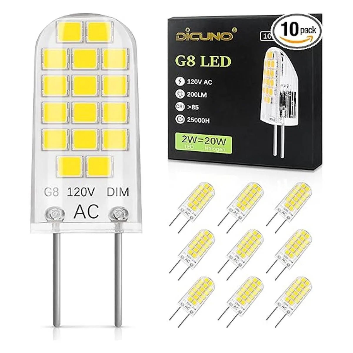 DiCUNO Bombilla LED G8 regulable, 2 W equivalente a 20 W, luz blanca diurna 5000 K, 120 V, T4 JCD tipo bipin para debajo del gabinete, iluminación de mostrador, paquete de 10