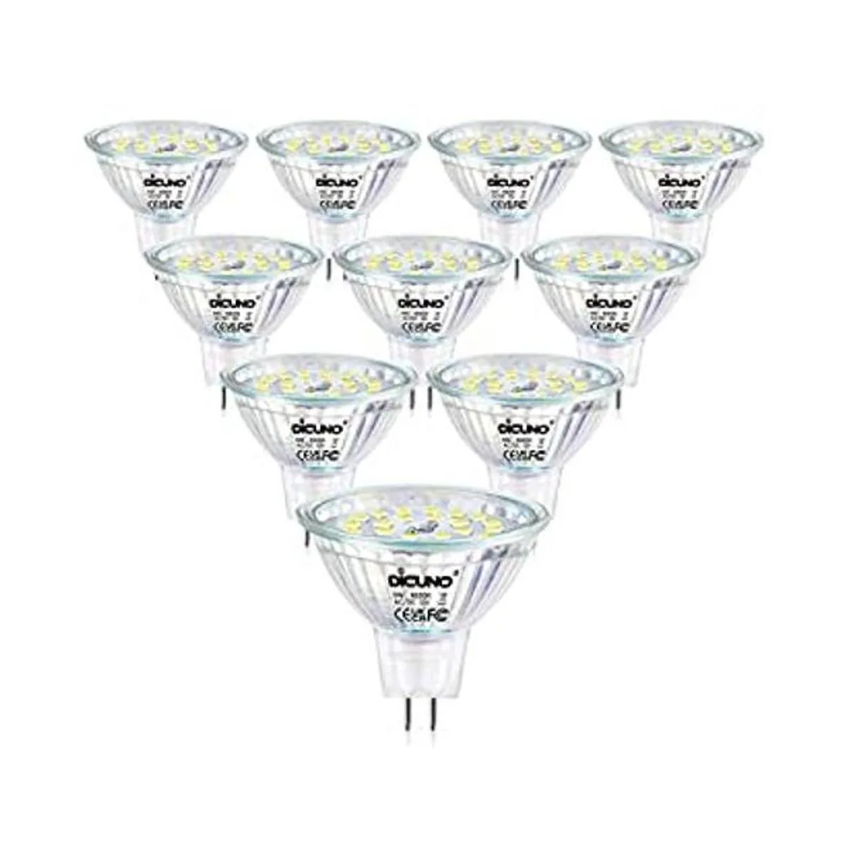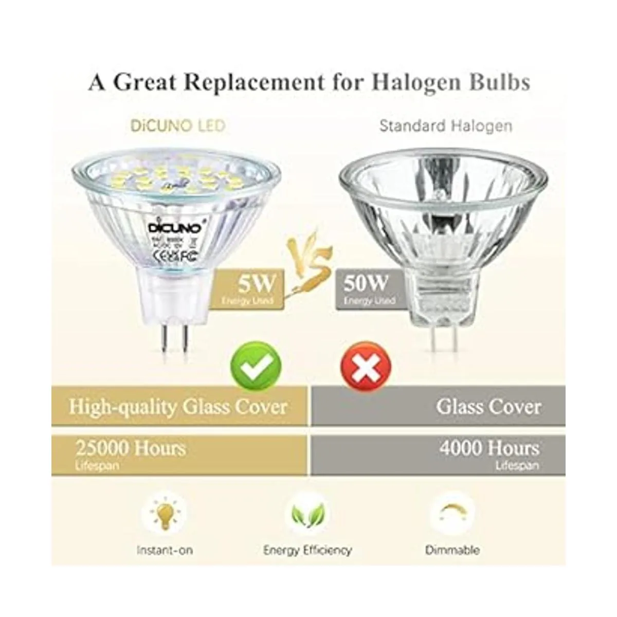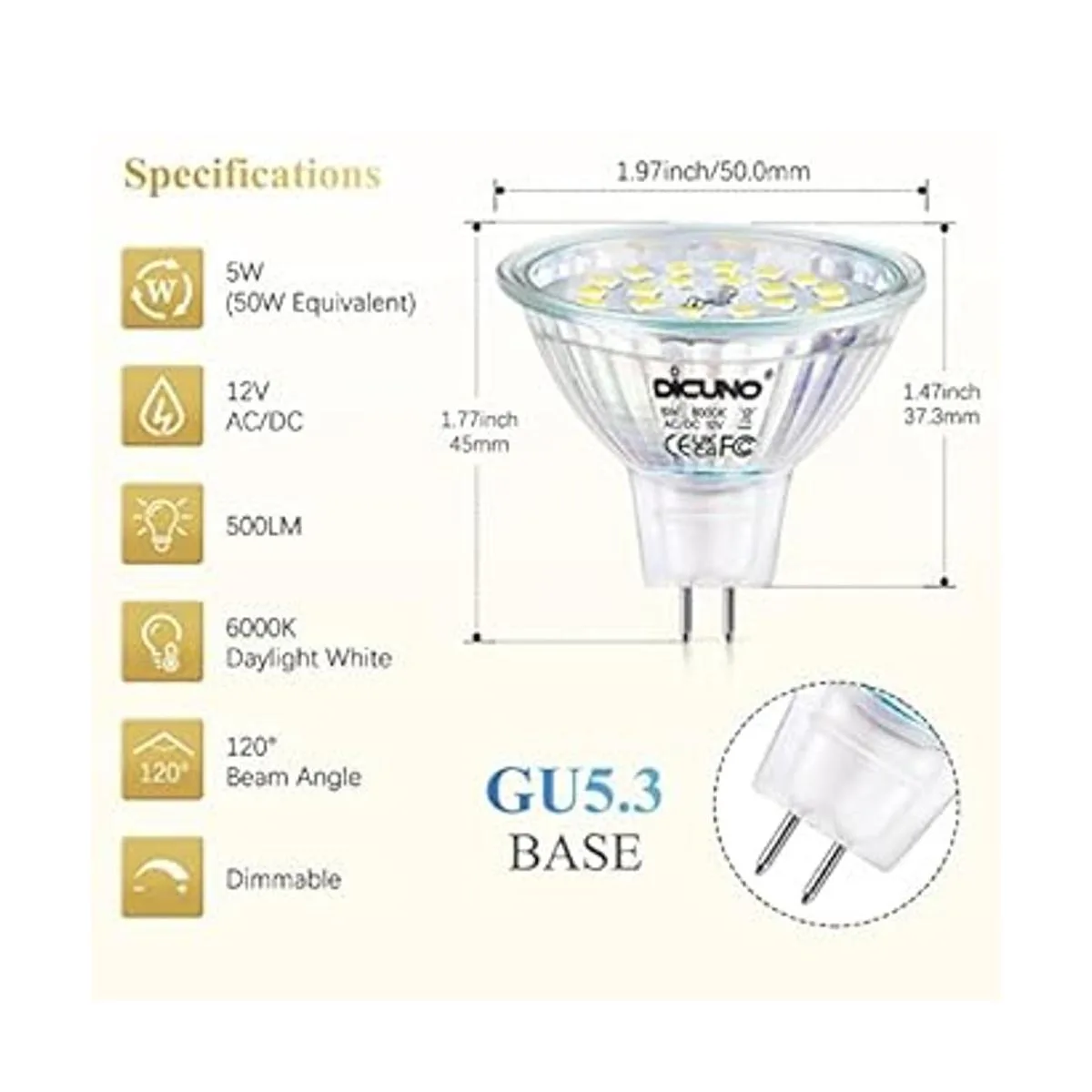 DiCUNO MR16 Bombillas LED regulables de luz diurna blanca de 6000 K, 50 W, equivalente a halógenos de 12 V ACDC, 5 W GU5.3 cubierta de vidrio con base bipin de 120 grados ángulo de haz 500 lúmenes, iluminación empotrada de pistas de foco de paisaje, paquete de 10