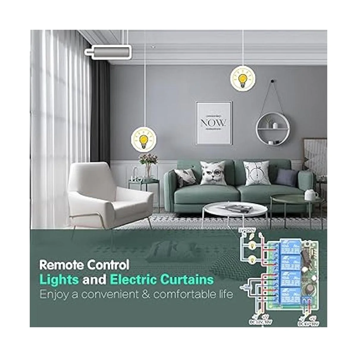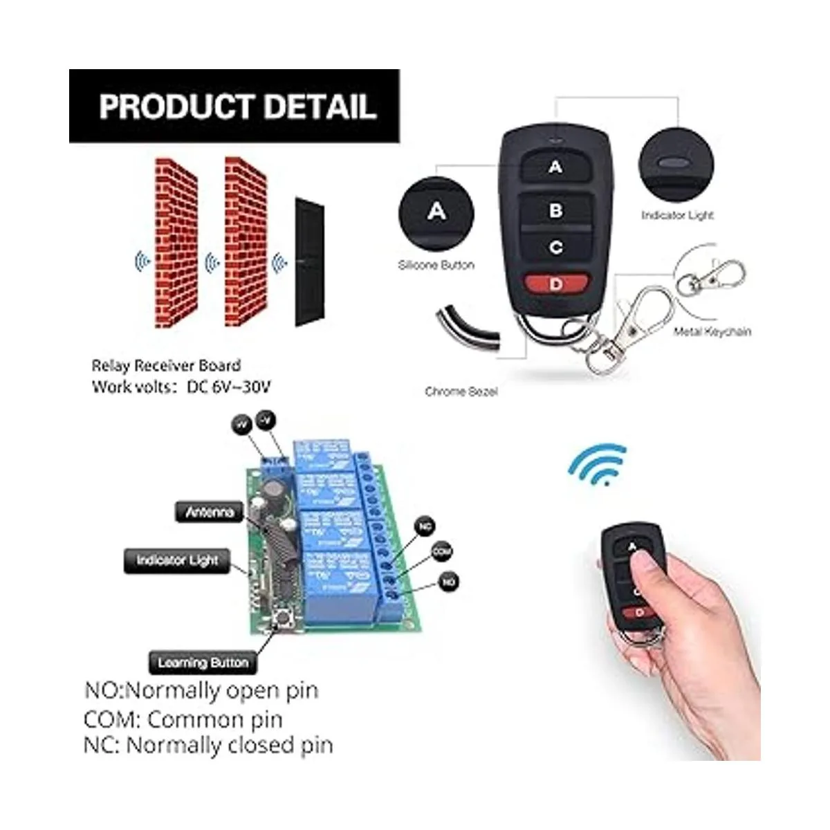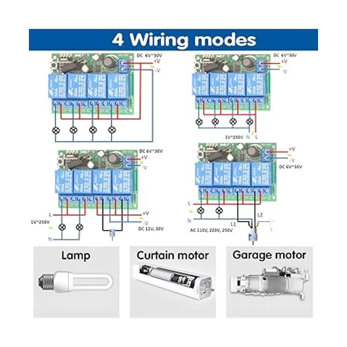 Más flexibilidad: este receptor contiene 4 relés, y hay 3 terminales normalmente abiertos, comunes, normalmente cerrados para cada relé. Estos 4 relés son independientes, por lo que puedes controlar cada uno de ellos de forma independiente. Cada receptor puede almacenar alrededor de 20 transmisores. Y un transmisor puede controlar múltiples receptores el transmisor necesita coincidir con el receptor. Por ejemplo, puedes utilizar dos relés para controlar la puerta del garaje o el motor y los otros dos para controlar las luces.