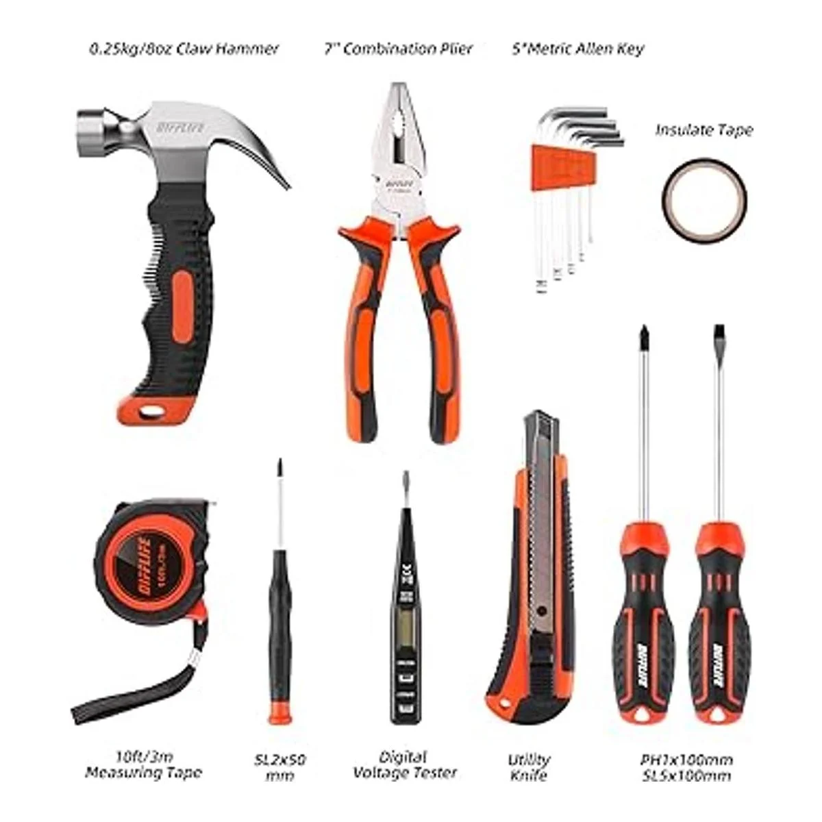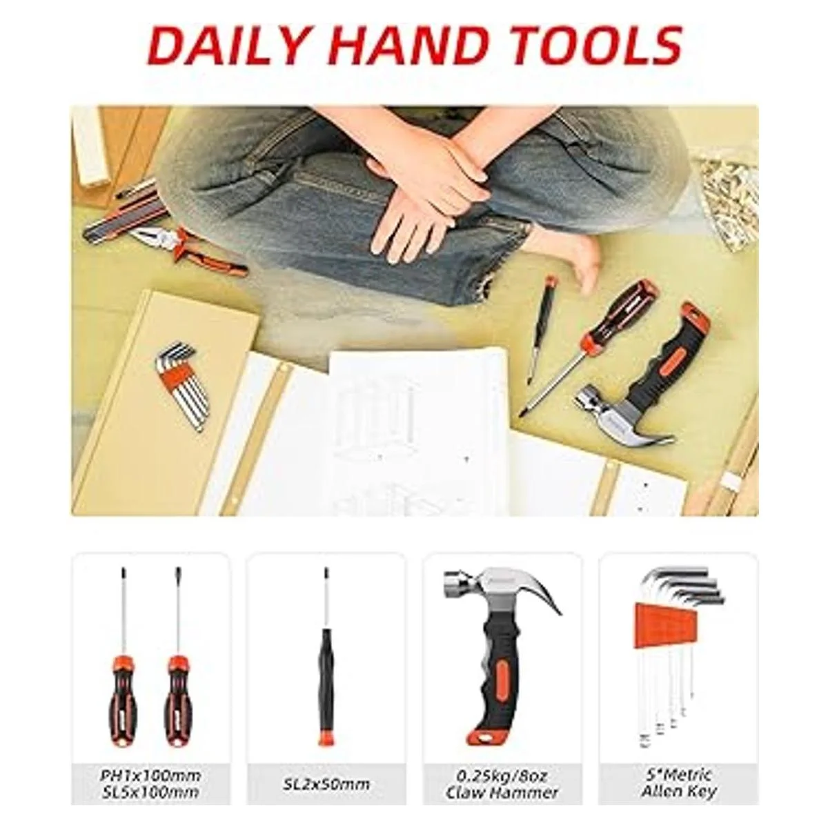 Accesorios completos: se coloca un rico conjunto de accesorios de herramientas actualizados en este juego de herramientas. Este kit de herramientas para el hogar incluye una llave combinada, martillo de garra, cortadores de alambre, cinta métrica, cuchillo multiusos, destornillador y mucho más. Este juego de cajas de herramientas es perfecto para las necesidades diarias.