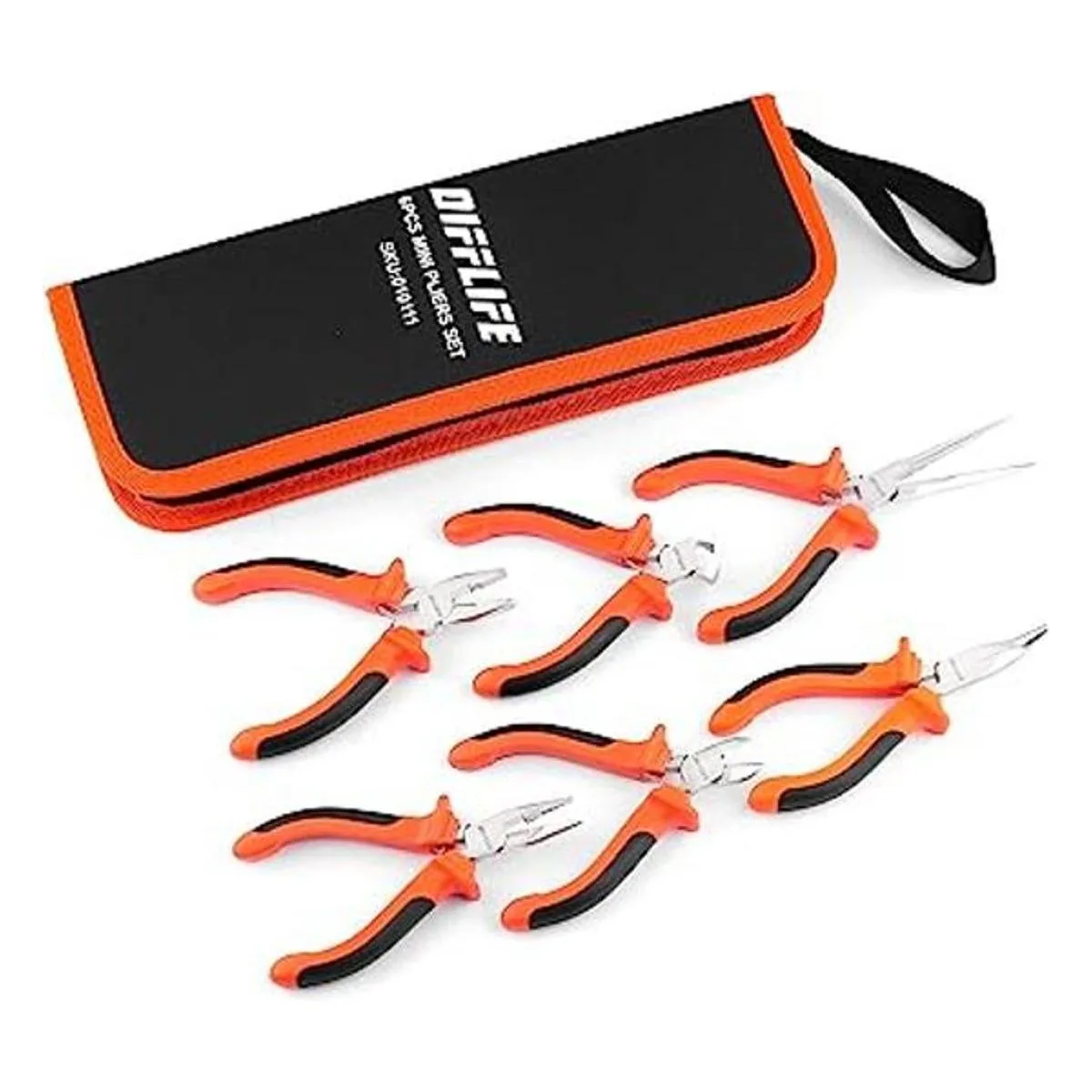 DIFFLIFE Juego de mini alicates, punta de aguja de 6 piezas, diagonal, nariz larga, nariz doblada, corte de extremo y linesman, para joyas, hacer manualidades, reparación de dispositivos electrónicos, con bolsa 6 piezas