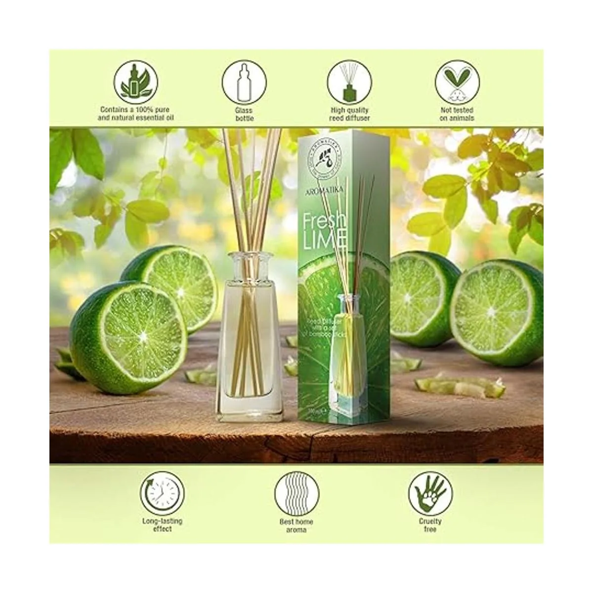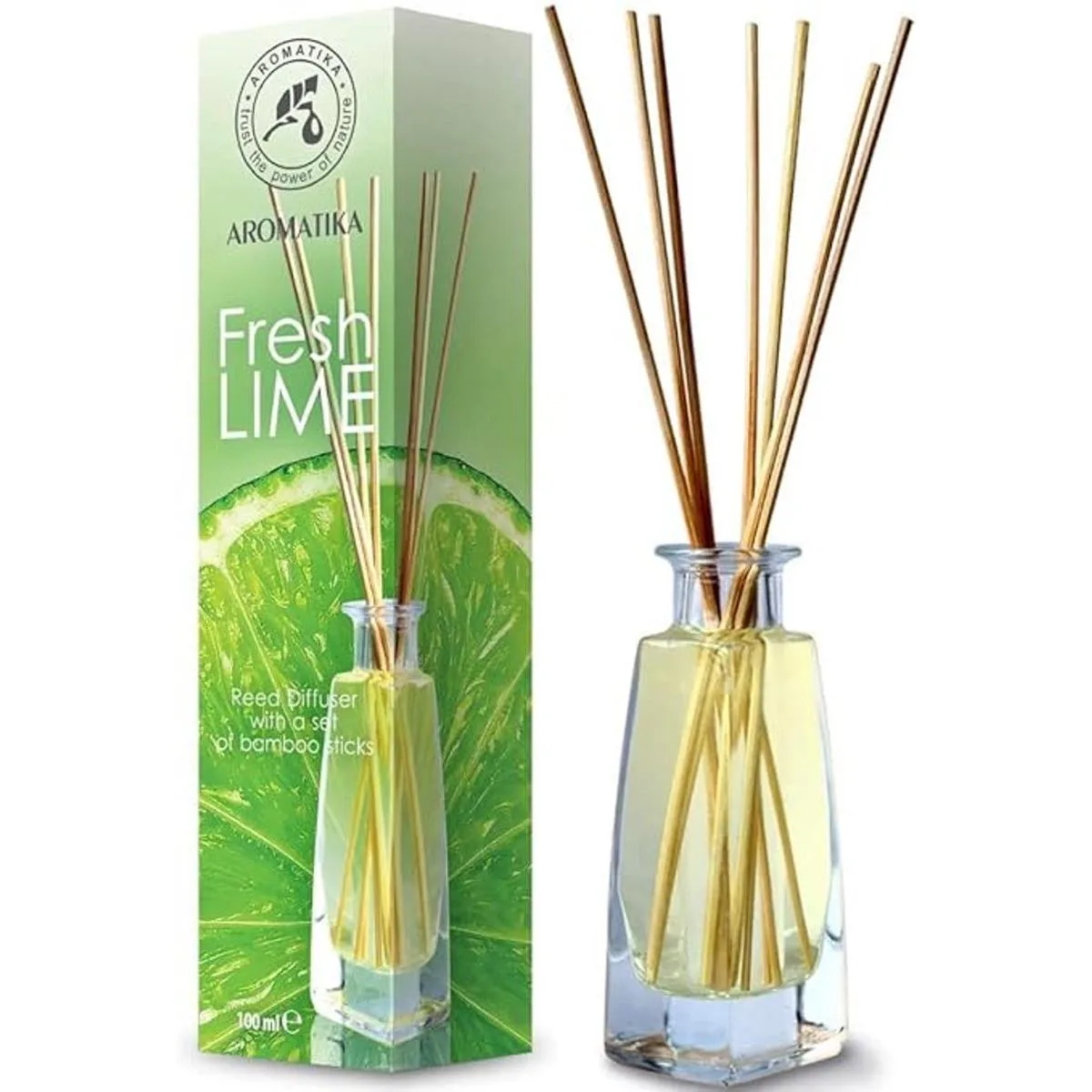 Difusor de varillas de lima de 3.4 onzas líquidas, fragancia fresca y duradera, juego de alcohol con 8 varillas de bambú, bueno para aromaterapia, spa, hogar, cocina, baño, oficina