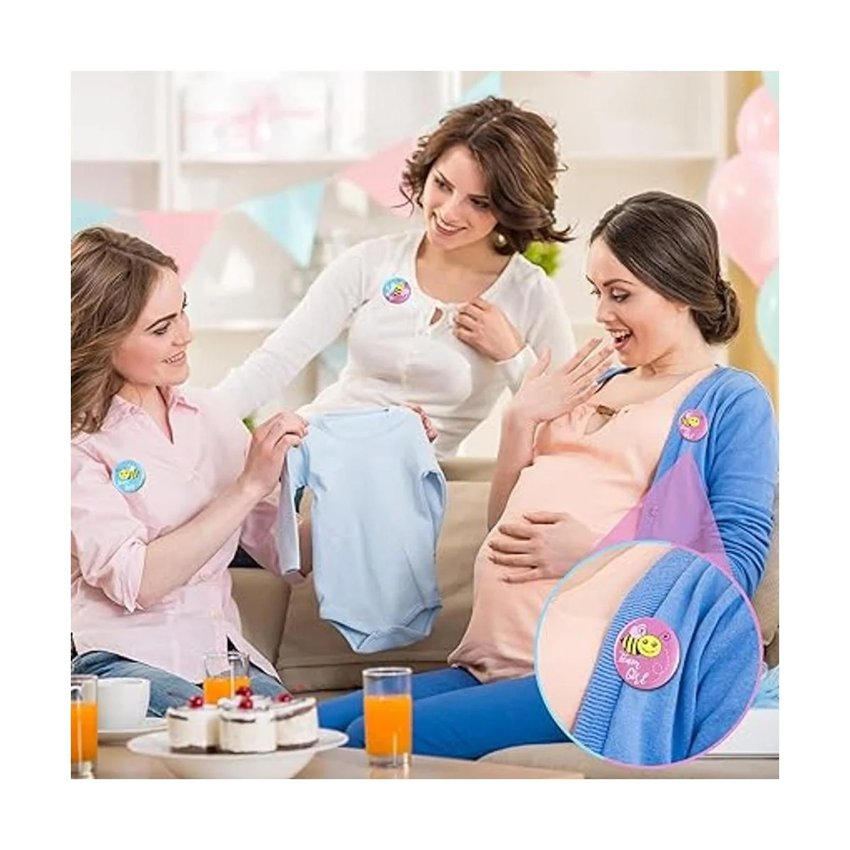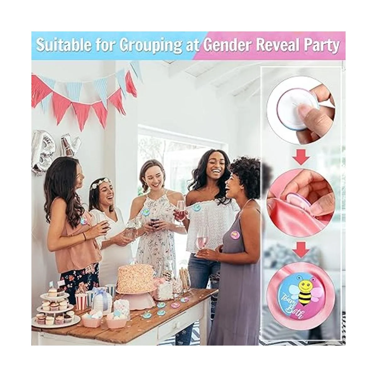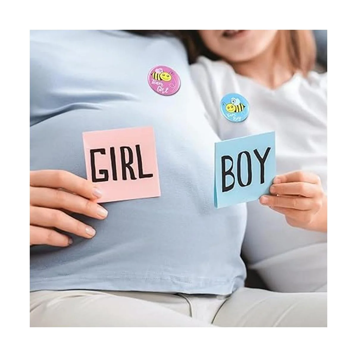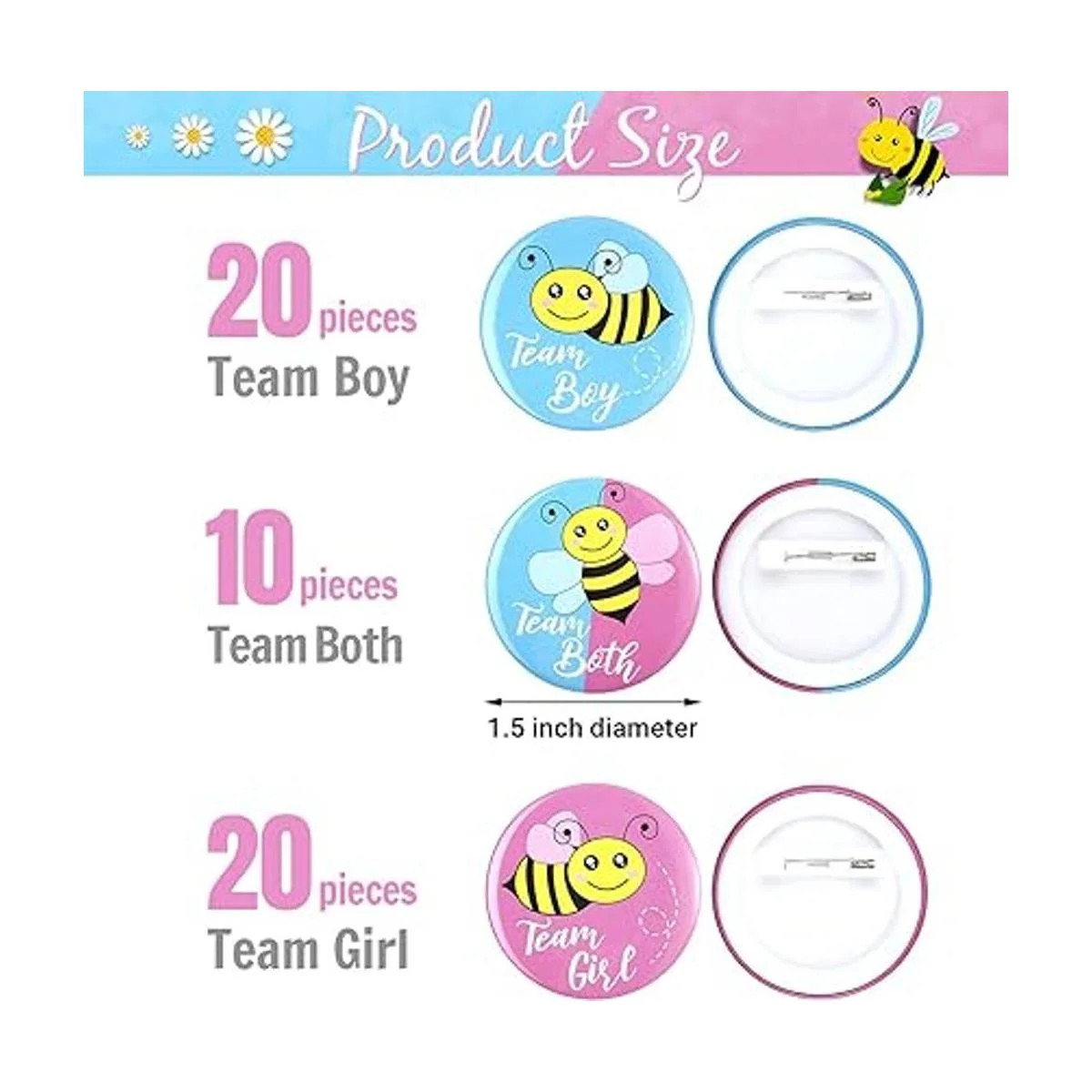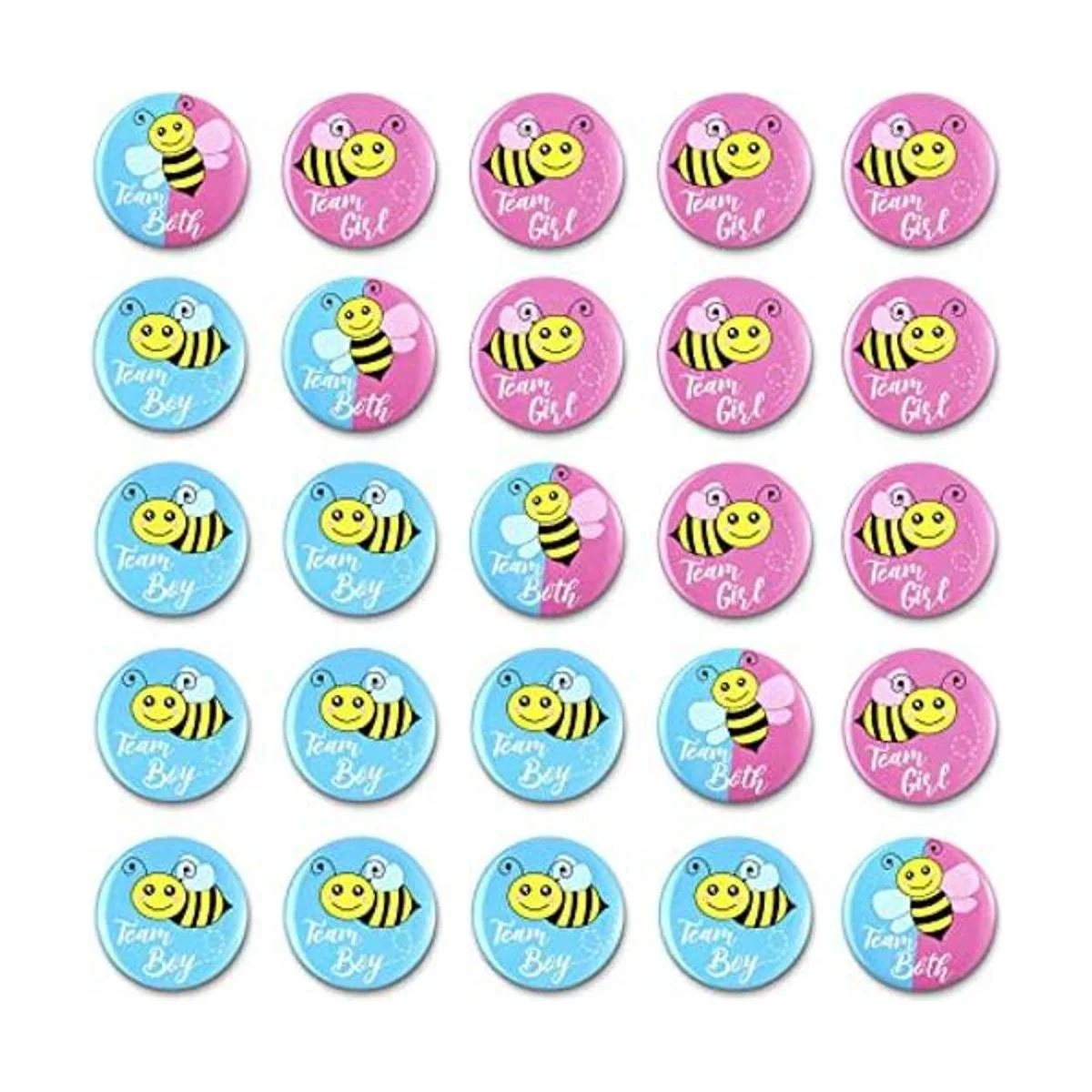 Diseño temático de abeja: los pines de botón de revelación de género están impresos con color brillante, bonitas palabras y patrón de abeja, incluyendo pines de Team Boy en color azul, pines de Team Girl en color rosa, y ambos pines en color azul y rosa, cubre todas las posibilidades, incluso gemelos