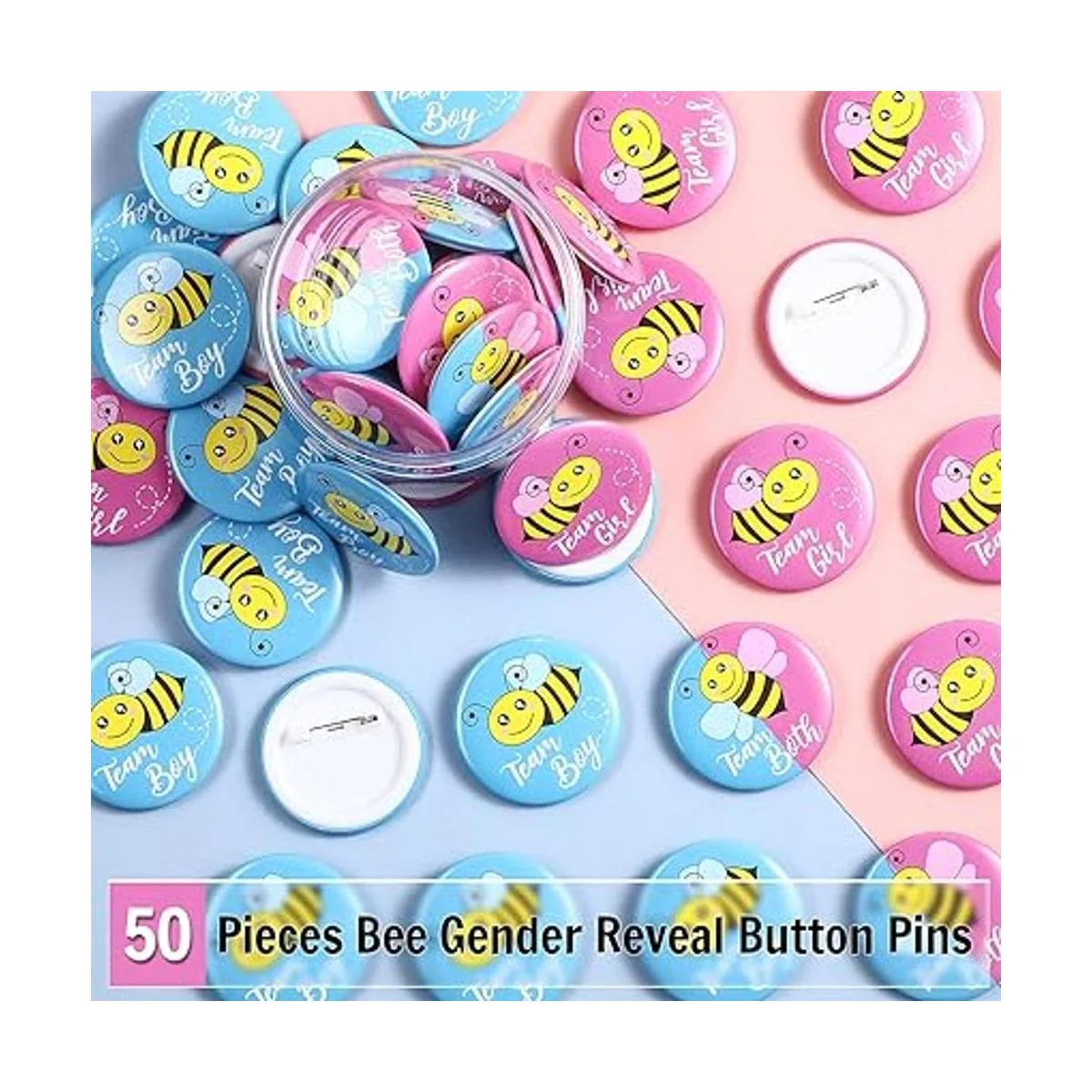 Dilunave 50 pines de botón de revelación de género de abeja, para niños, niñas o ambos, kit de insignias con tema de abeja, recuerdos de fiesta de revelación de género en rosa y azul para baby shower, suministros de juego de fiesta de revelación de género