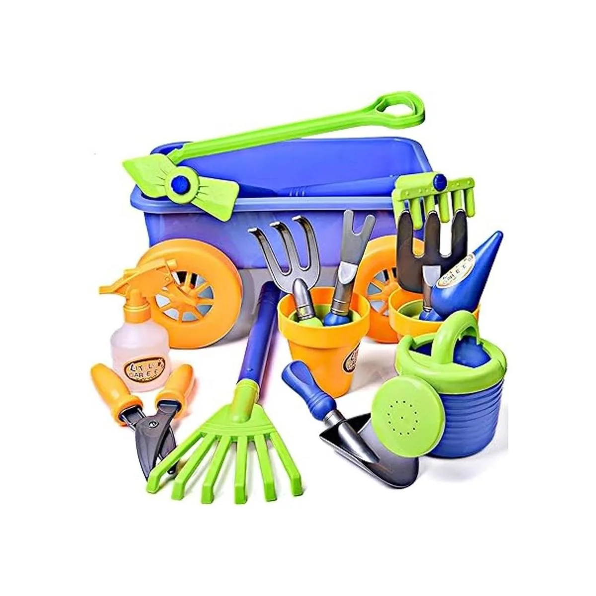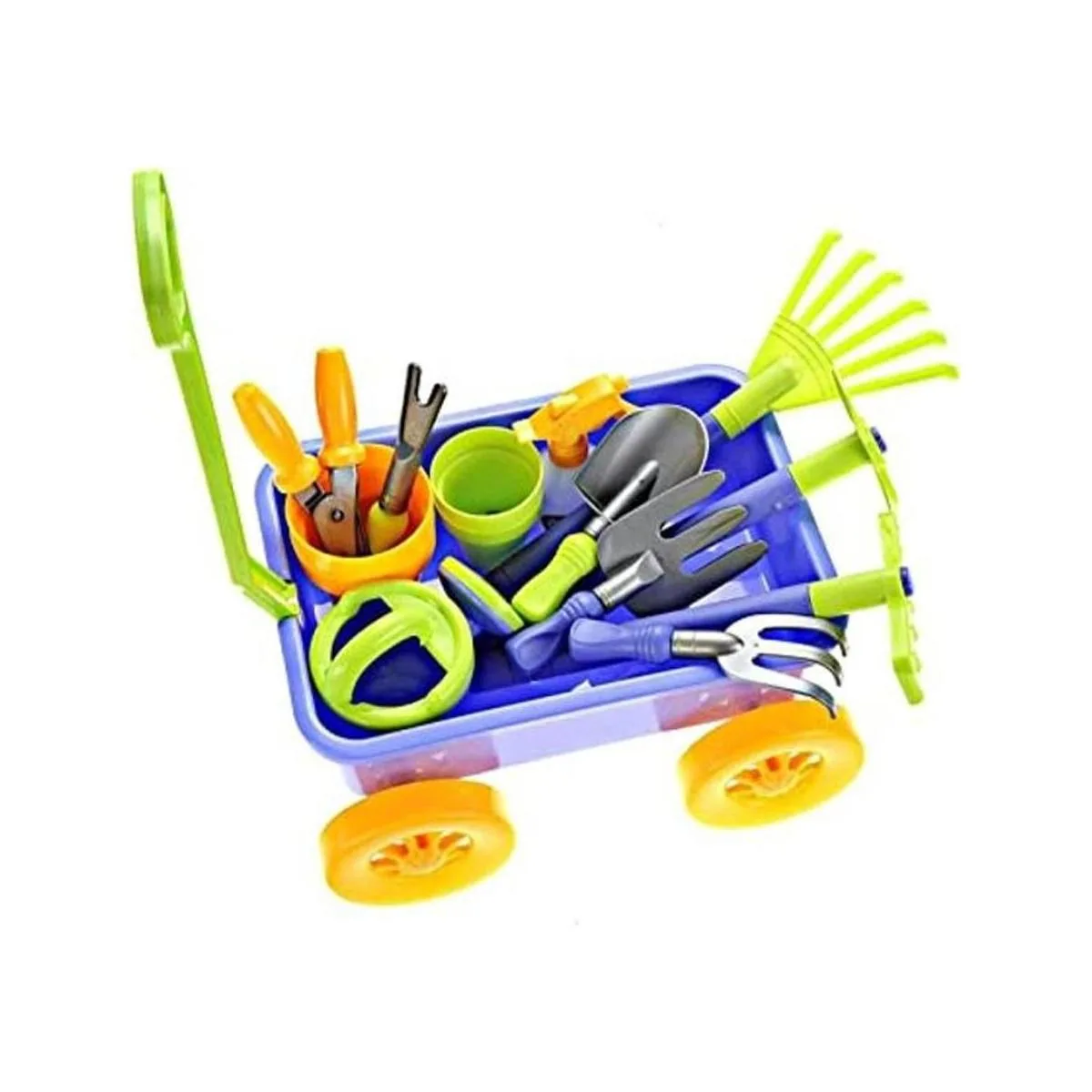 Dimple Juego de juguetes de carro y herramientas de jardín de 15 piezas de alta calidad, herramientas de jardinería y carro, resistente y duradero, patio superior, playa, arena, juguete de jardín, ideal para niños y niños pequeños conjunto de juguetes de jardín, verde individual