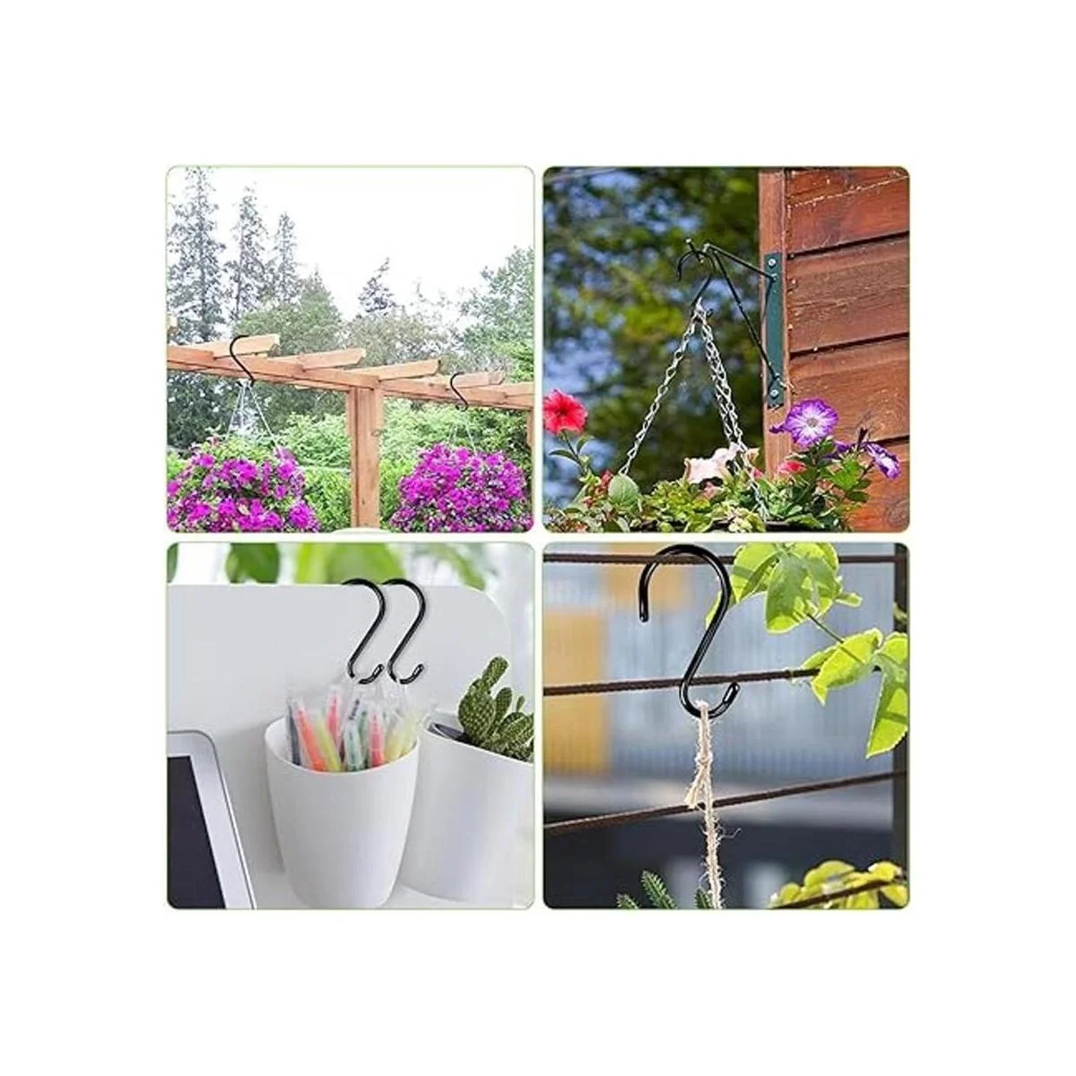 Diseño práctico: estos ganchos en forma de S son una solución simple y amigable para ahorrar espacio, no necesita taladrar en tu hermosa casa y pared, puedes colgarlos en estantes, bares, estantes, barra y colocarlos en armario, cocina, garaje, baño, jardín, interior y exterior.