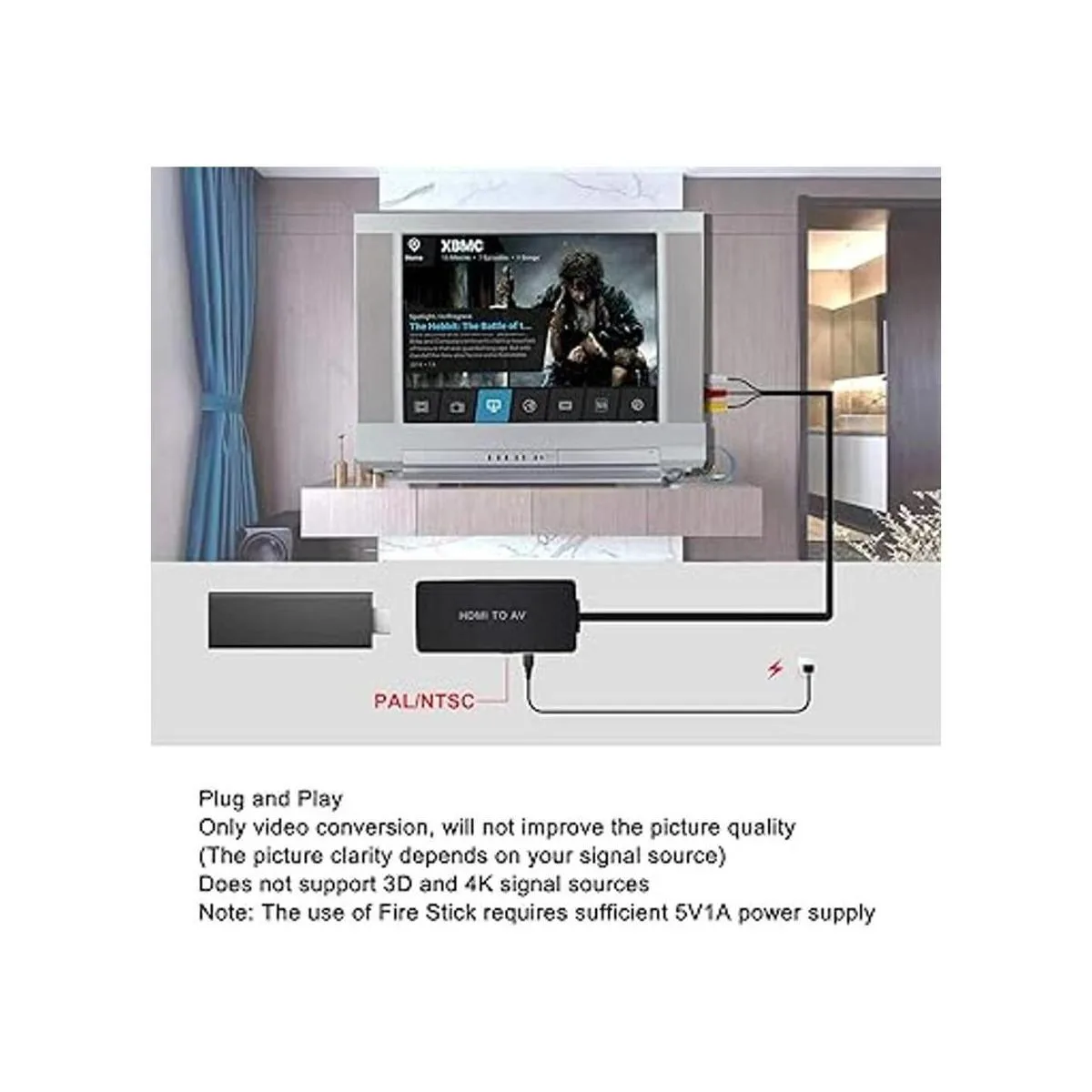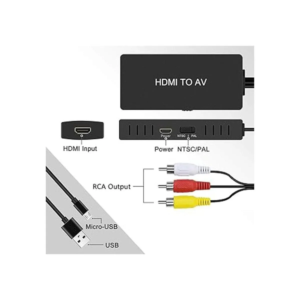 Adaptador HDMI a compuesto. Configura el formato NTSC cuando lo utilices en Estados Unidos Necesita conectar una fuente de alimentación externa a través de un cable micro USB, consumo de energía máximo 5 W