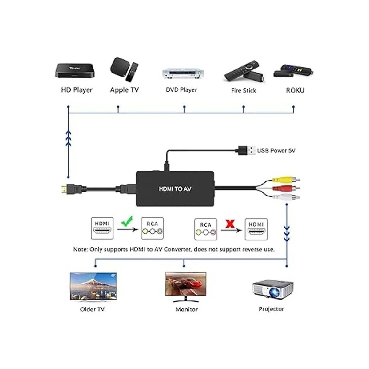 Convertidor HDMI a RCA: convierte la señal HDMI a vídeo compuesto RCA AV y señales de audio estéreo L/R, conecta a un proyector de TV o monitor RCA antiguo;
