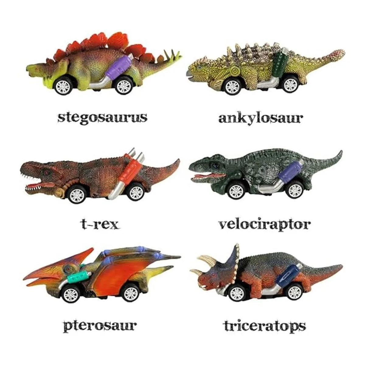 Paquete de 6 coches de dinosaurio: una colección de 6 autos de juguete de dinosaurio roadster hechos de forma artística son perfectos para niños de 3 años. Nuestros juguetes de dinosaurio incluyen TRex, Triceratops, Stegosaurus, Ankylosaur, Pterosaurio y Velociraptor.