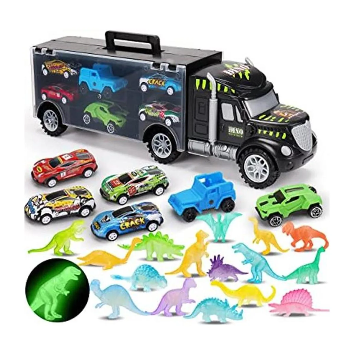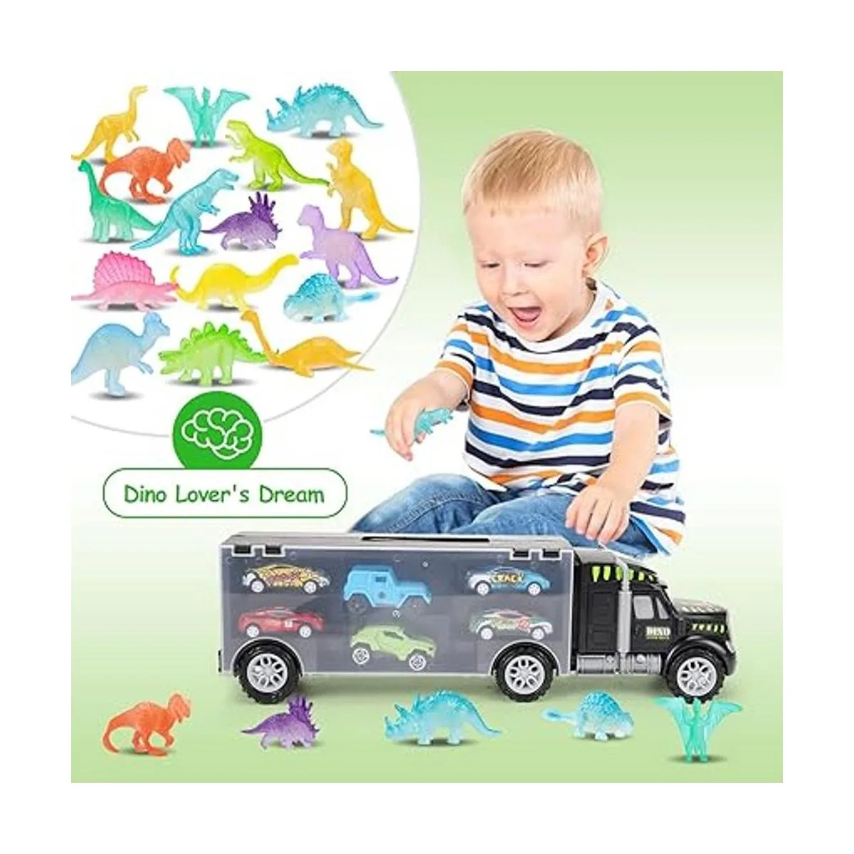 Dinosaur Car Carrier Toy Our dinosaur transport truck toy set combine realistic dinosaurs with cars element makes kids more exciting Just push, the big truck and mini toy cars can run a long distance with no battery required. A hit for kids that love trucks and dinosaurs Boys toys age 34 45 56 years old.