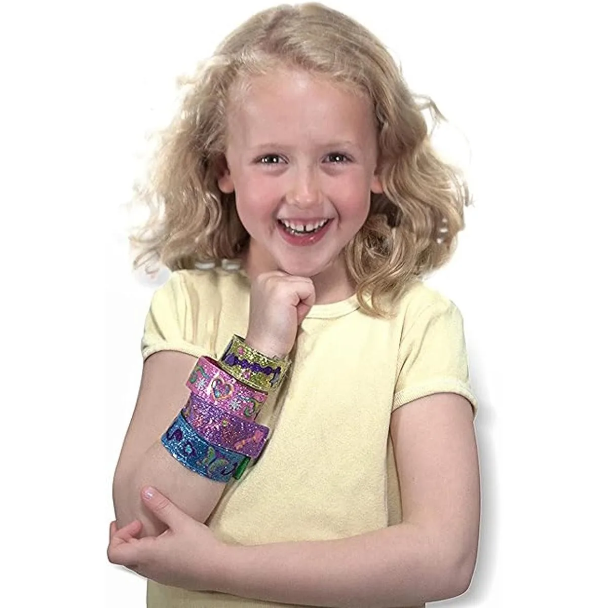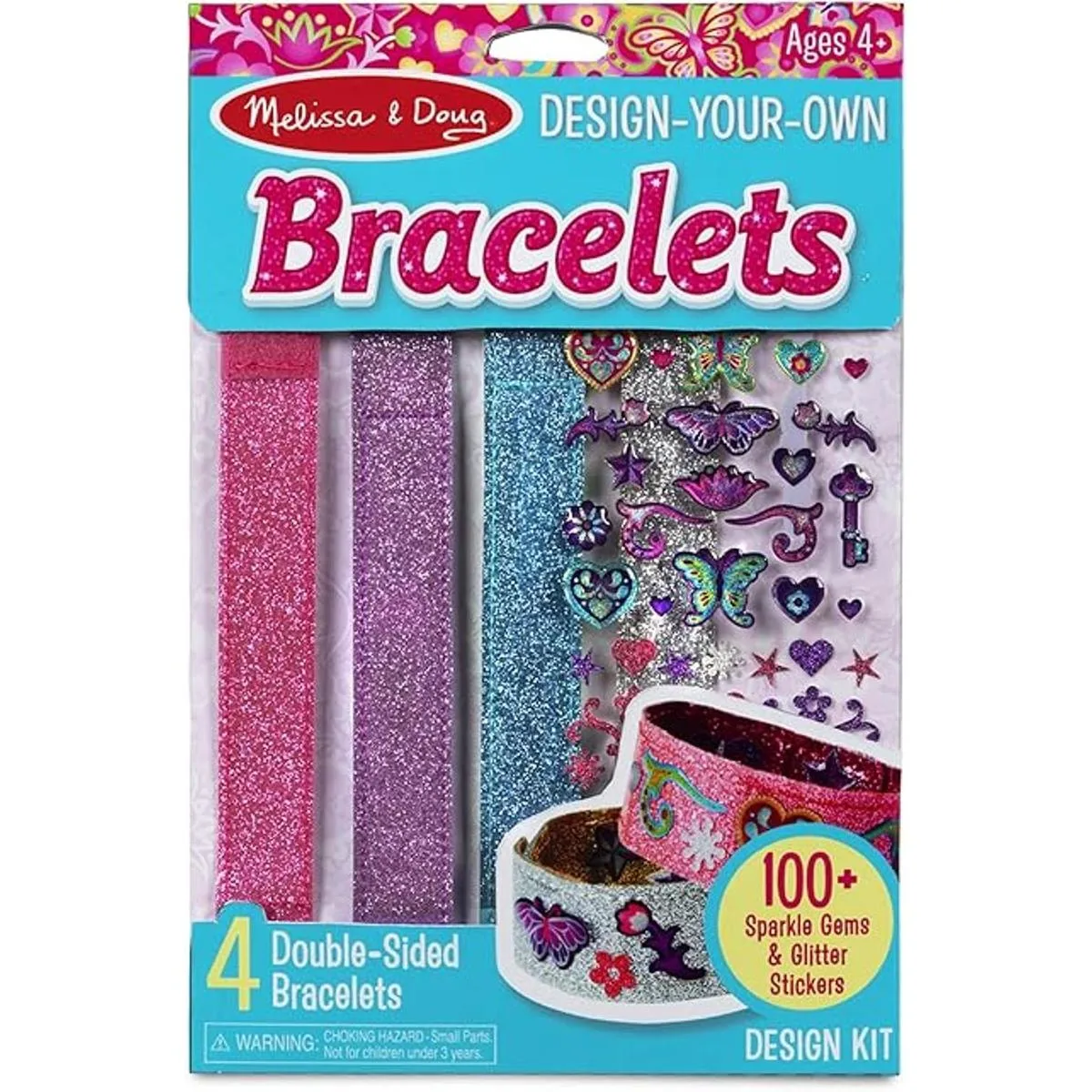 Juego de pulseras de diseño automático: el juego de pulseras Melissa Doug DesignYourOwn incluye 4 pulseras de doble cara y más de 100 gemas brillantes y calcomanías de purpurina. Se pueden llevar como un montón o solos.