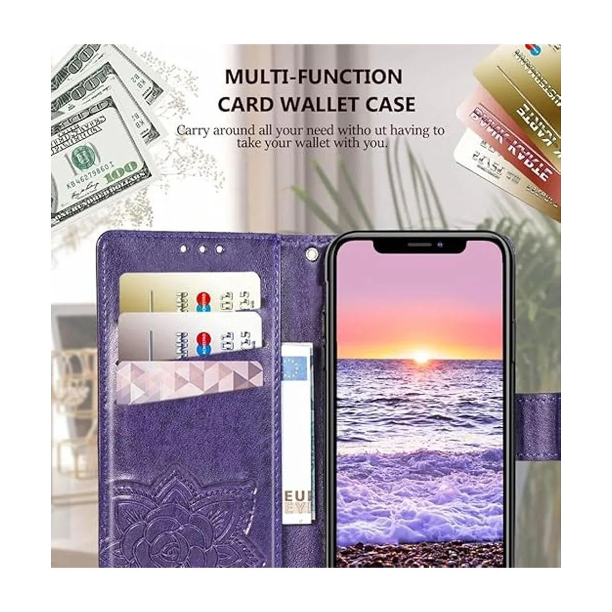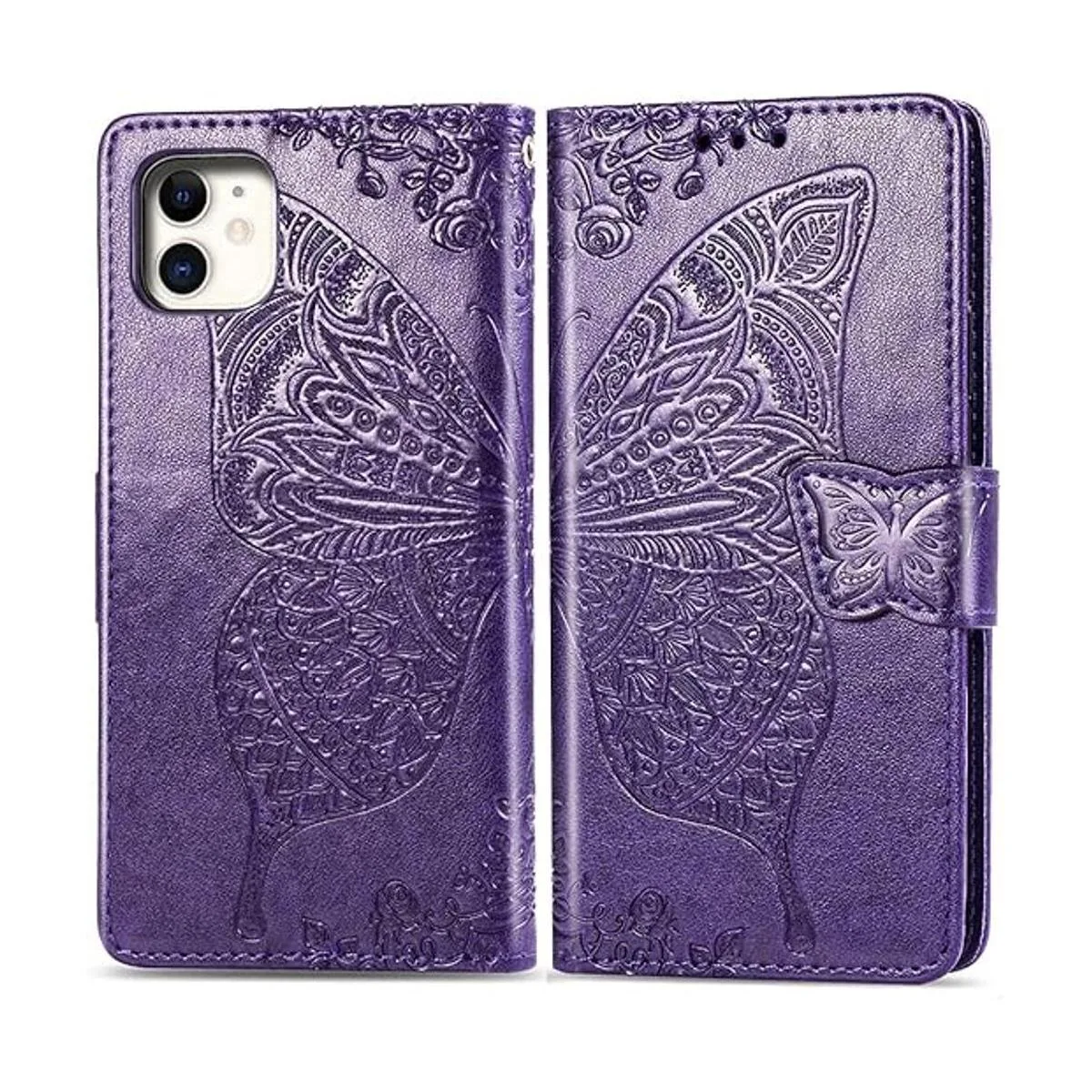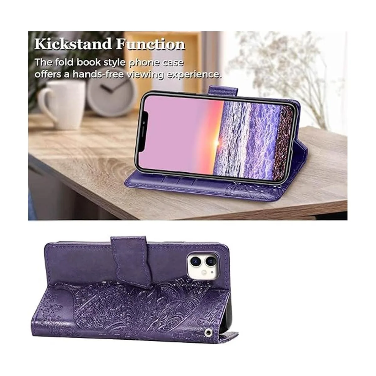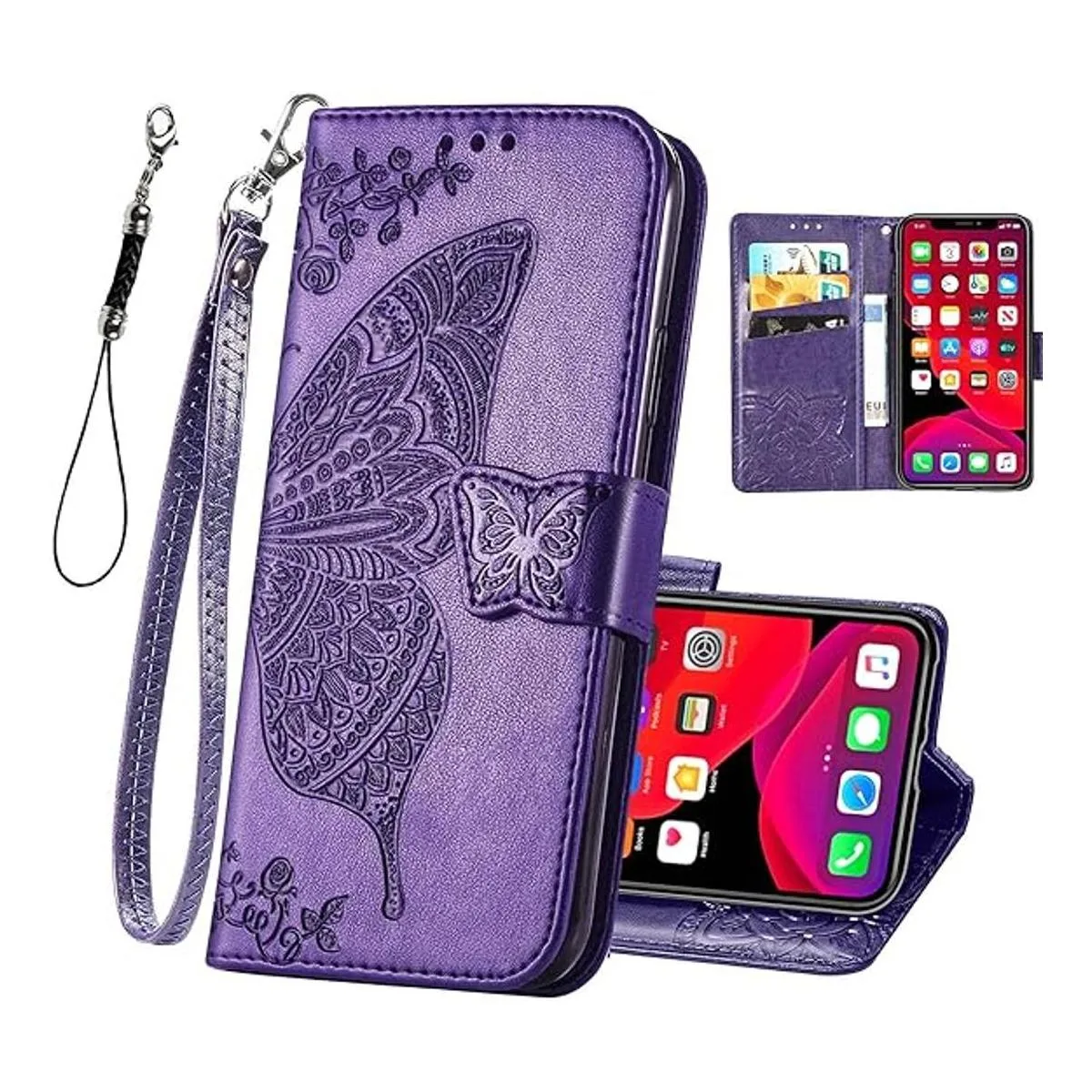 Diseñada para iPhone 11, funda tipo cartera con tapa para mujer con diseño de mariposa en relieve de piel sintética con ranuras para tarjetas de crédito, correa magnética desmontable para iPhone 11 de 6.1 pulgadas morado
