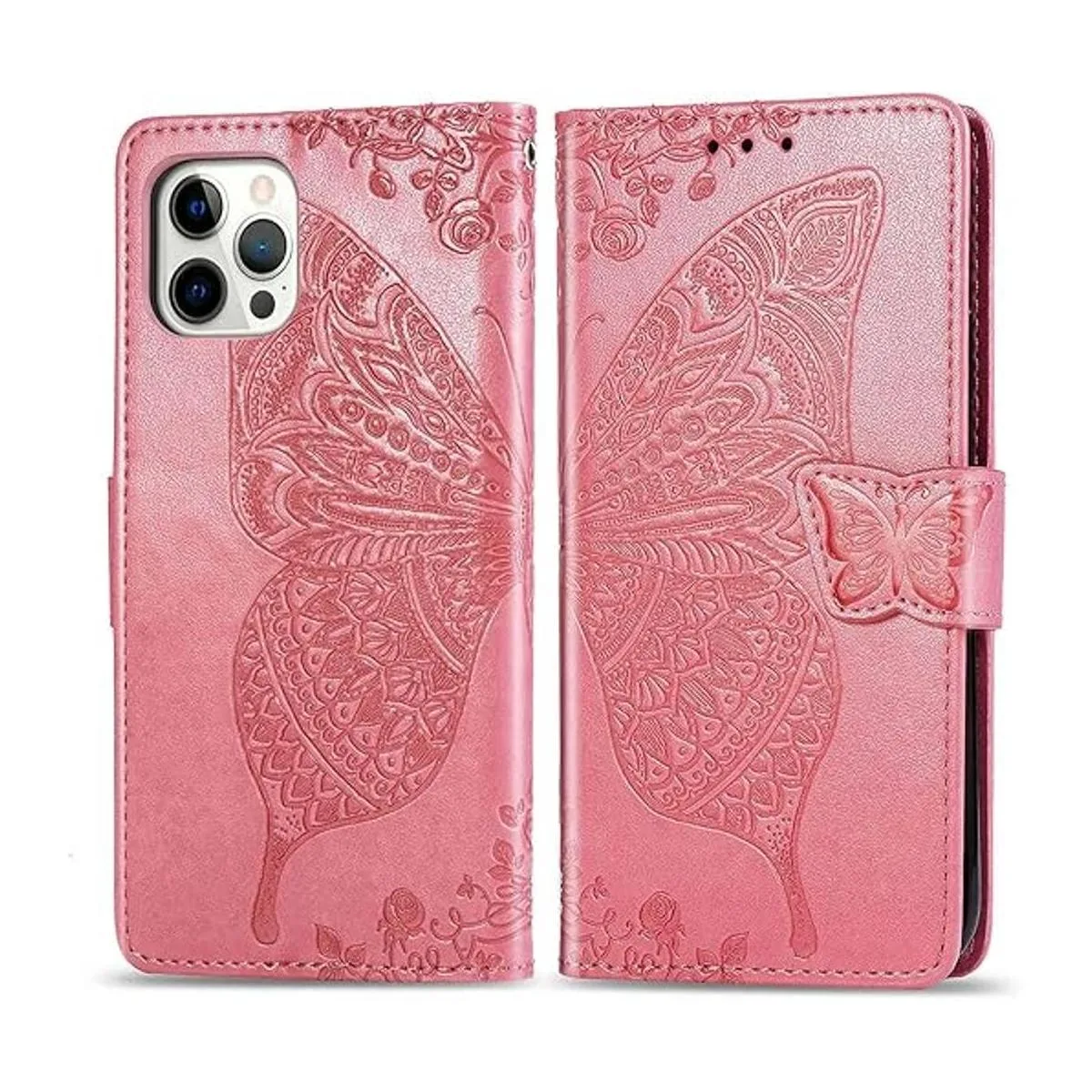 Diseñada para iPhone 12 ProiPhone 12, funda tipo cartera con tapa para mujer con diseño de mariposa en relieve de piel sintética con ranuras para tarjetas de crédito, correa de muñeca para iPhone 1212 Pro de 6.1 pulgadas rosa