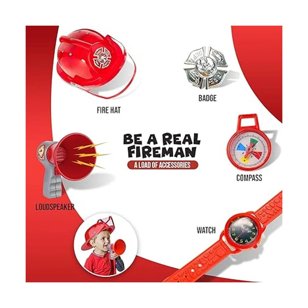 Características ajustable bombero casco, megáfono de trabajo, y un montón de accesorios