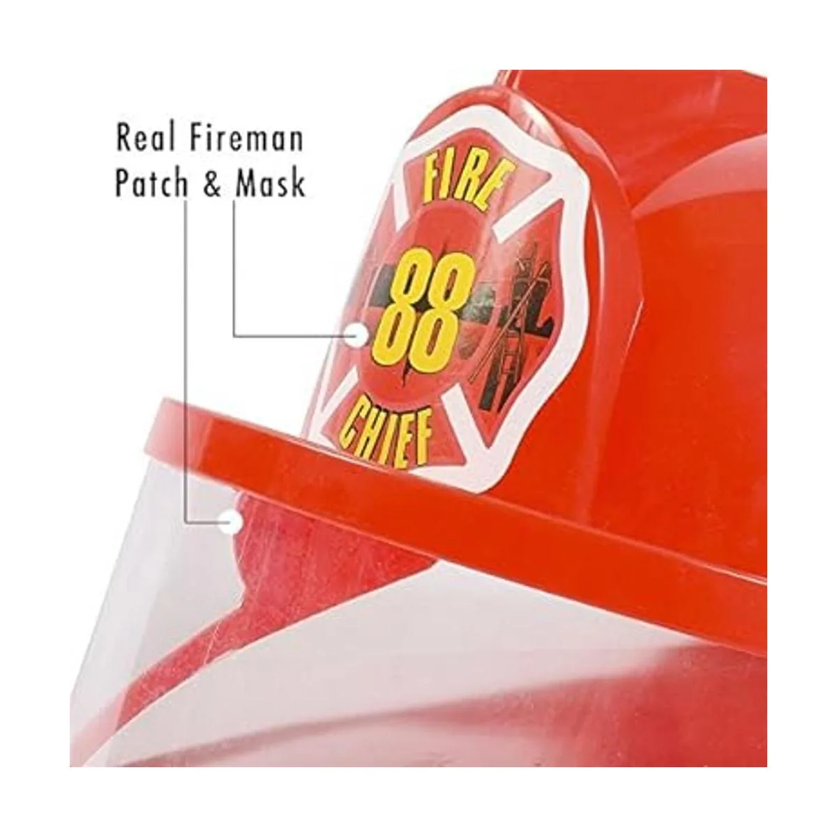 El casco de bombero rojo está hecho de plástico duro y cuenta con emblema de fuego que tiene un escudo ajustable que se puede llevar hacia arriba o hacia abajo.