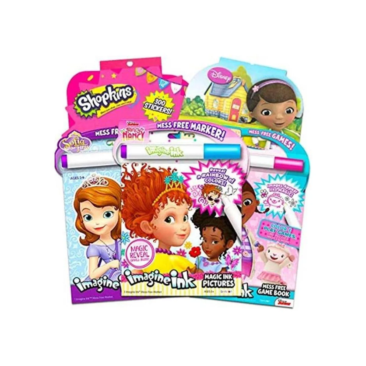 Disney Junior Fancy Nancy Magic Ink Juego de libros para colorear 3 libros de tinta para niños y niños con Fancy Nancy, Sofia the First y Doc McStuffins paquete de colorear sin líos. Incluye 300 pegatinas Shopkins y 300 pegatinas Doc McStuffins 16 hojas de pegatinas y 600 pegatinas en total.